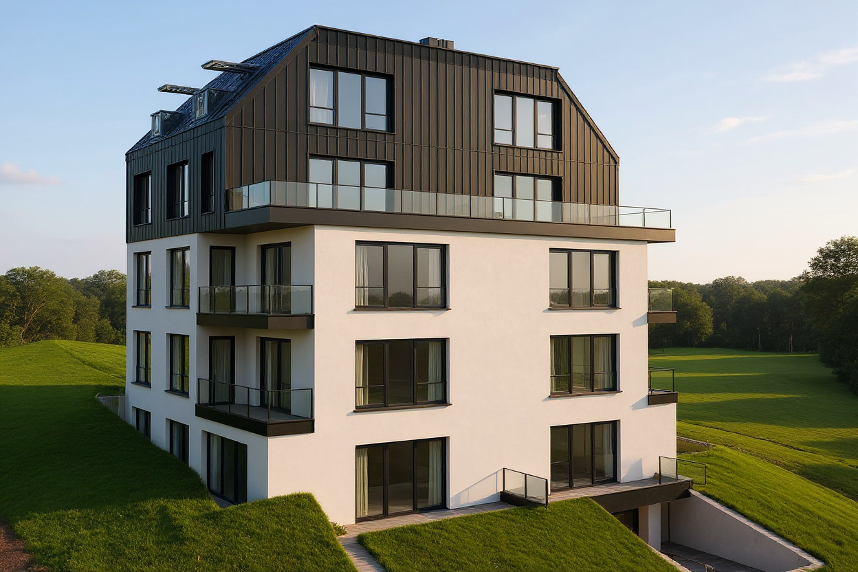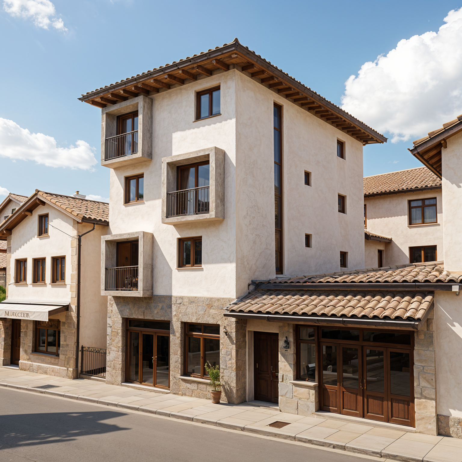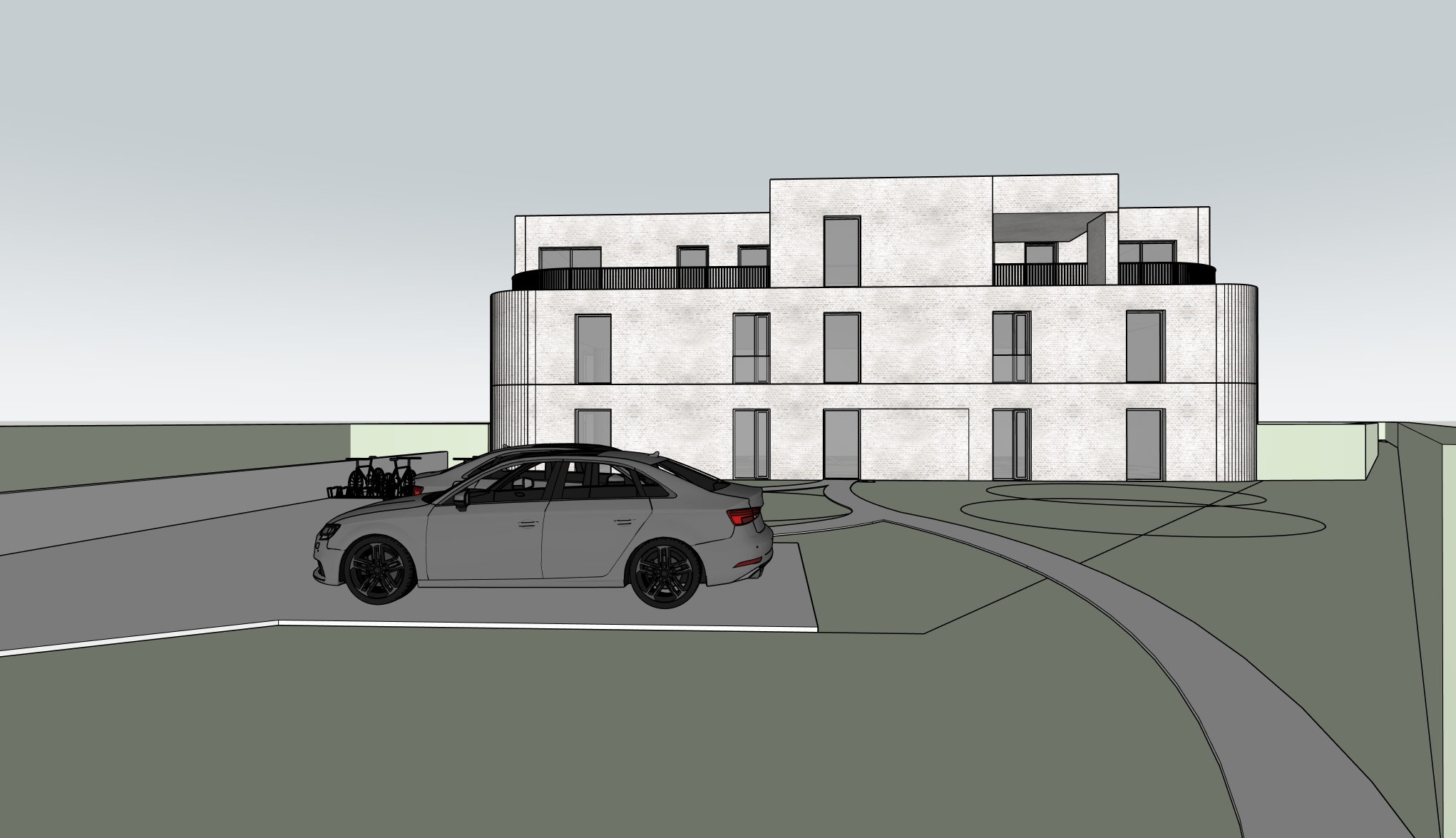 make a high realistic render use the same materials as in the render white brick and use the same brick for the wholl building use a lot of plants and add trees on the right side