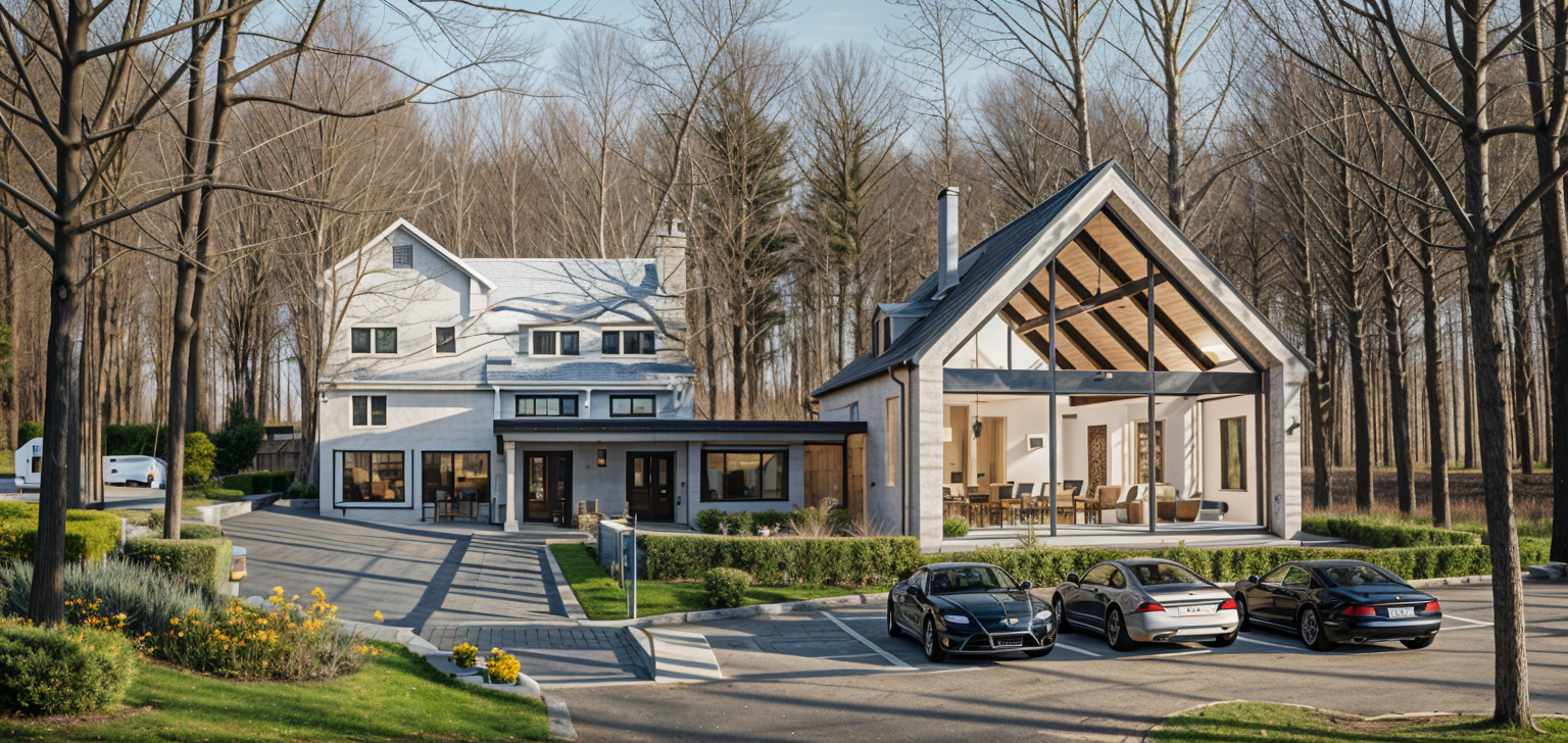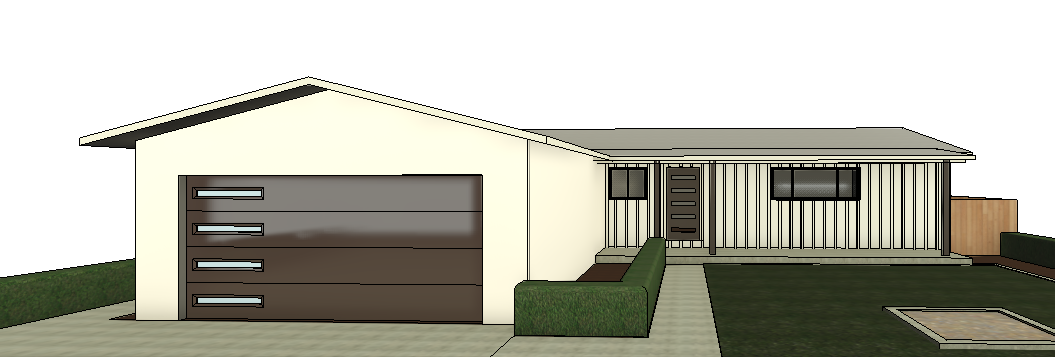 white stucco garage dark wood modern garage door white board and batten green hedge around yard green front lawn colorful sky dark brown porch posts white window frames trees behind house