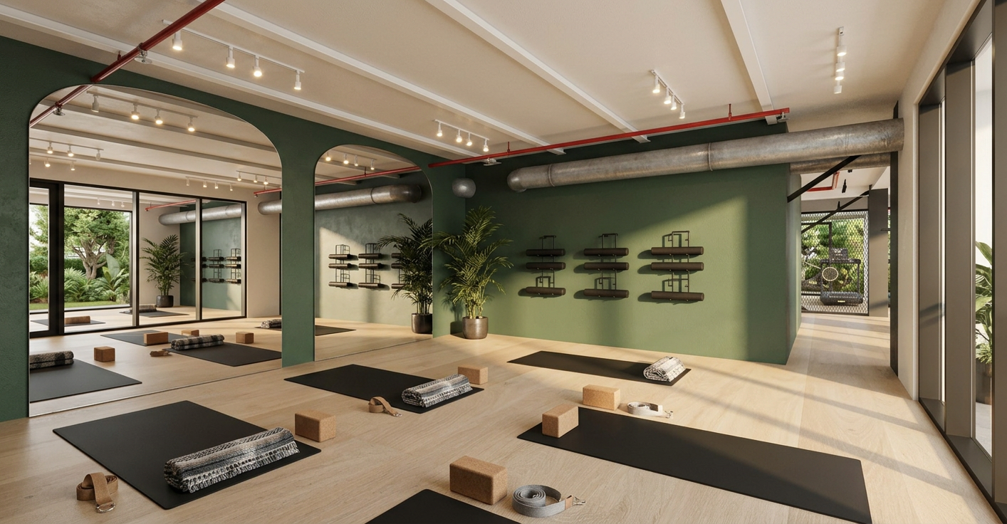 enhance this restaurant interior render without changing any geometry proportions panel layout niches doors furniture kitchen cabinets island columns or flooring do not add any spotlights keep all original colors materials and textures exactly as they appear including walls panels mirrors tables chairs upholstery light blue kitchen cabinets green black walls fluted columns island tiles black cheddar beige doors floors and wallpaper lock the ceiling geometry but paint it beige to match the previous interior view refine all surfaces walls panels mirrors marble tables wooden chairs mosaic floor kitchen cabinets columns and island for subtle realism and texture enhancement enhance existing concealed warm led lighting along the ceiling perimeter contouring all elements the ceiling intersects with walls panels columns niches and island to create depth and subtle reflections lighting and materials should remain soft warm cinematic and realistic producing gentle shadows and enhancing the luxurious yet understated atmosphere without changing any geometry proportions layout or original colors except the ceiling color
