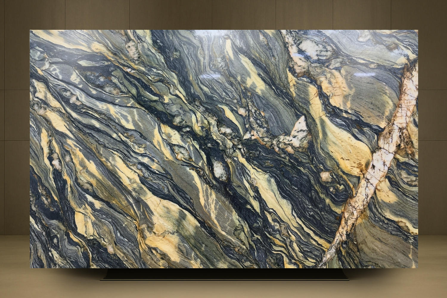 render a high end colorful design moodboard with ocean fantasy quartzite slab featuring paint colors wallpaper wood samples leather samples tile samples and coordinating metal fixtures ocean fantasy has shades of dark blue olive green and ocher