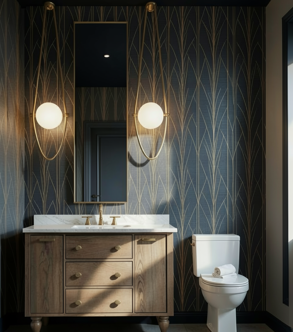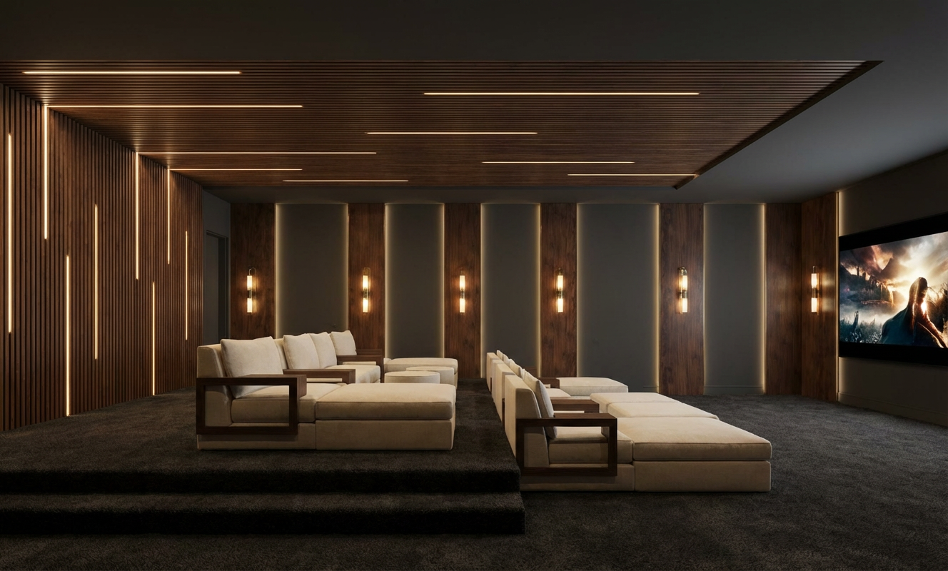 luxury home theater with walnut reeding in on ceiling and wall on left side add very thin soft strip lighting scattered here and there in the reeding parrallel with reeding brown walnut vertical panels on walls with this sconces only on panels shown soft glow from the sconces dark carpet flooring put a movie on the tv screen showing partially on the right hand side add a few people on the couches
