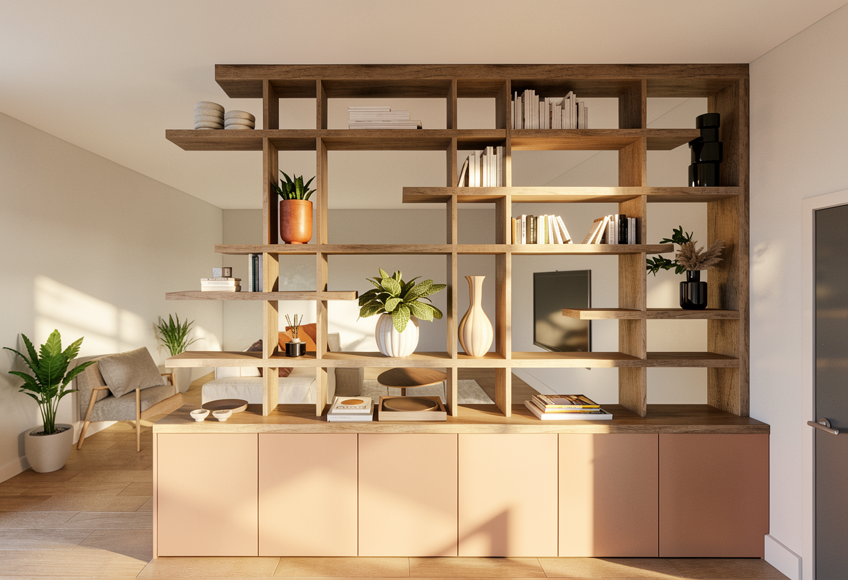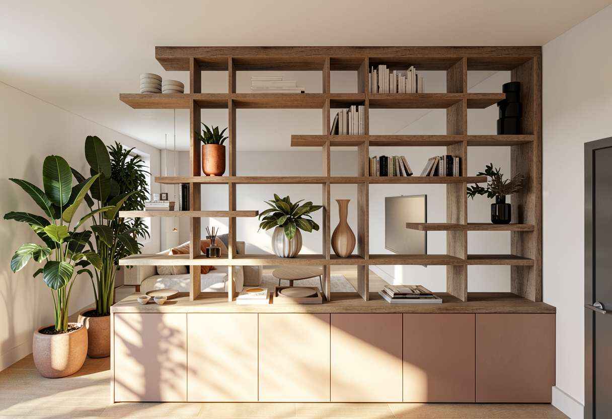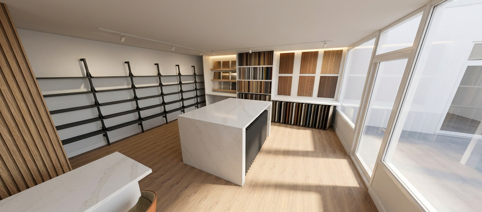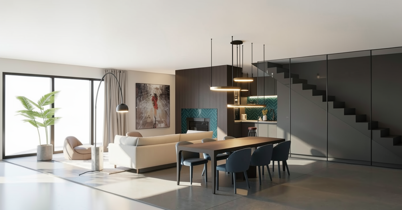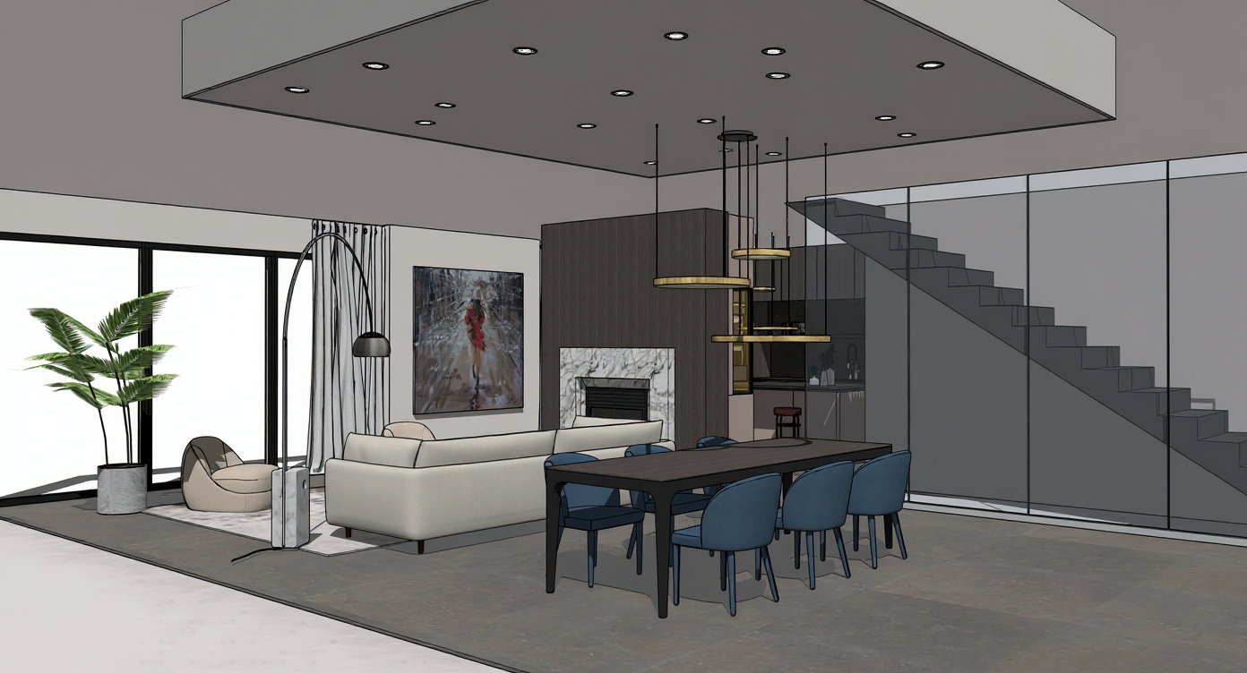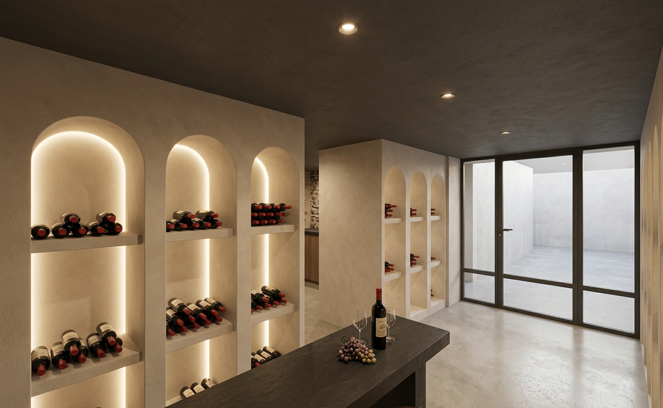 keep the existing architecture exactly as it is preserve all volumes wall positions niches shelving the glass partition the table and the overall spatial composition do not modify proportions perspective layout or lighting atmosphere required modifications the ceiling must be finished with lime plaster using the same texture and tone as the walls and the niches behind the glass partition add two white english style bookcases classic and elegant with traditional moldings and symmetrical shelving replace the floor behind the glass partition with a natural jute flooring woven jute texture on the central table remove the grape bunch add a wine glass filled with red wine keep the wine bottle on the table lighting and atmosphere preserve the integrated niche lighting maintain the warm minimalist wine cellar ambiance important do not modify the niches walls room proportions glass partition table shelving or overall layout the goal is to keep the existing design and architecture unchanged while applying only the requested material and object adjustments