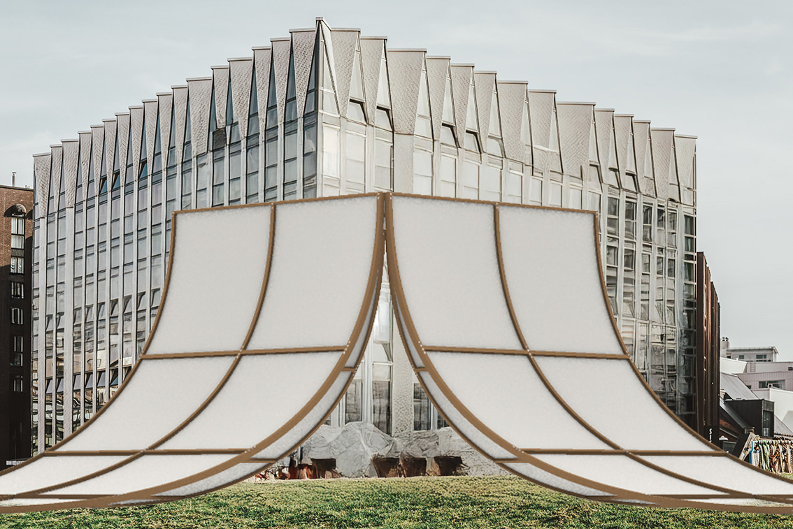 view of timber and linen pavilion on grass with office building background improve details of office building make beautiful poetic and cinematic lighting and shadows like in a mir render