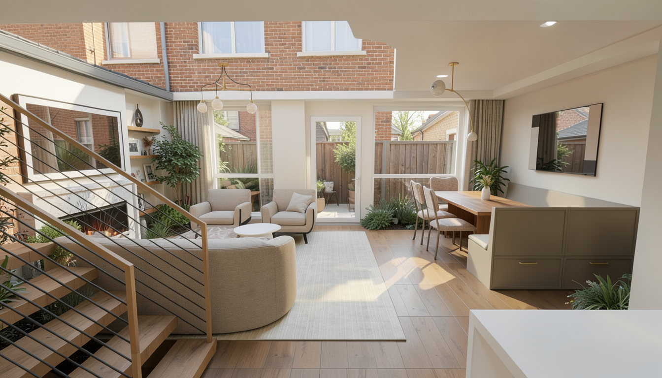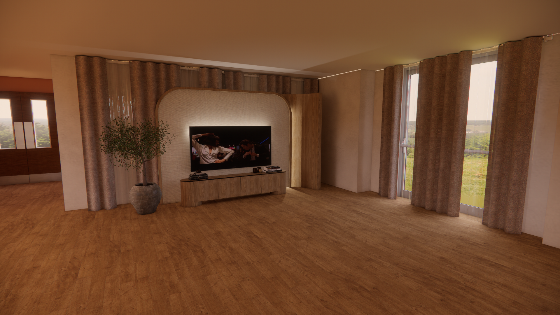 add people in the wheelchairs who are watching tv add a person of the left who is walking past them keep the materials like in the render the panel is textile add typical office panel ceiling and general lighting