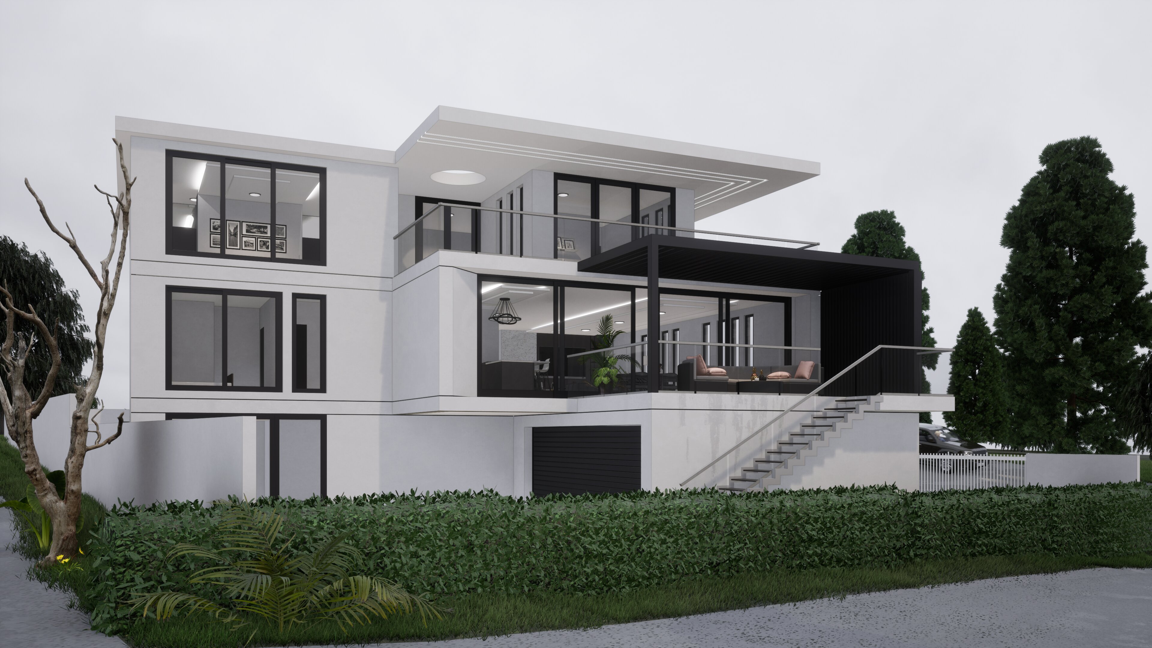the two storey luxury home is surrounded by a other residential homes and ascattering of australian native trees bushes with modern australian lansdcape design the external finishes are concrete with monument features