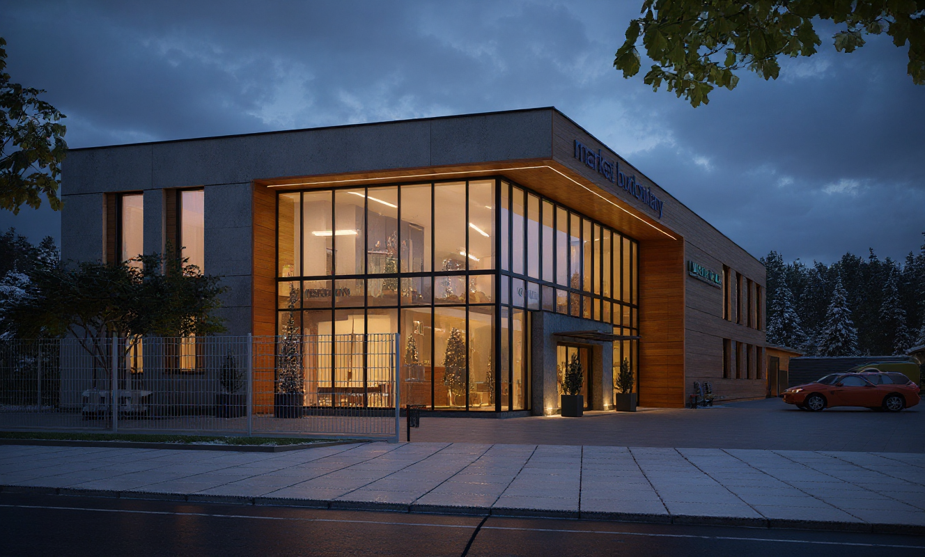 modern office building use facade materials such as architectural concrete glass drywood cladding around windows winter view holiday atmosphere show puddles in the square more snow