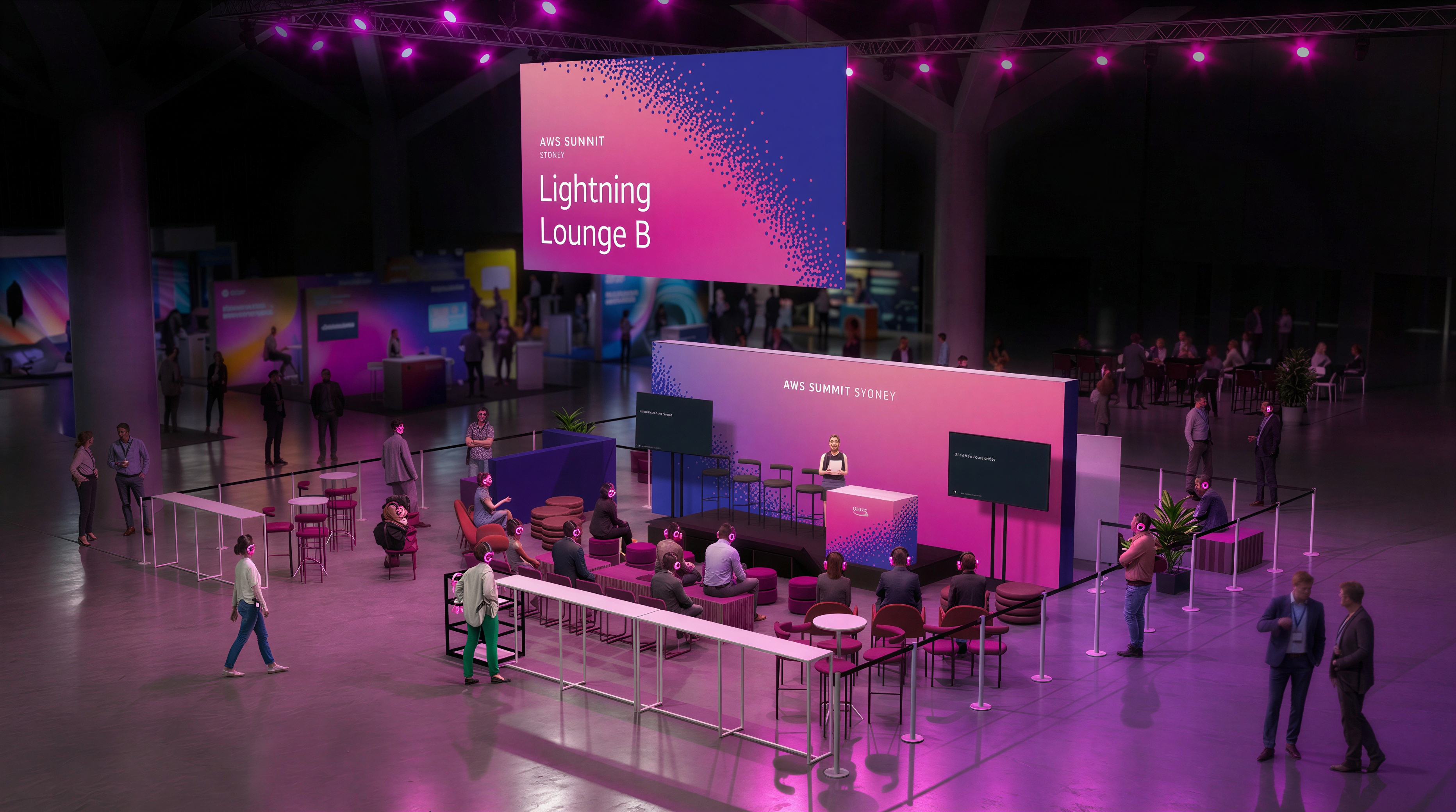 add square pink soft gobo lights on the floor converging away from the stage area