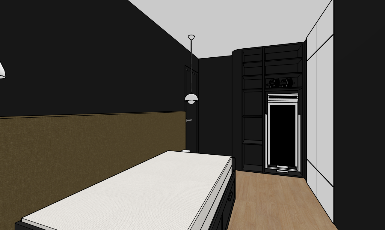 tapis de course pr sent dans le meuble au fond avec miroir ractangulaire sur le coter du meuble en gris clair sur la 3d