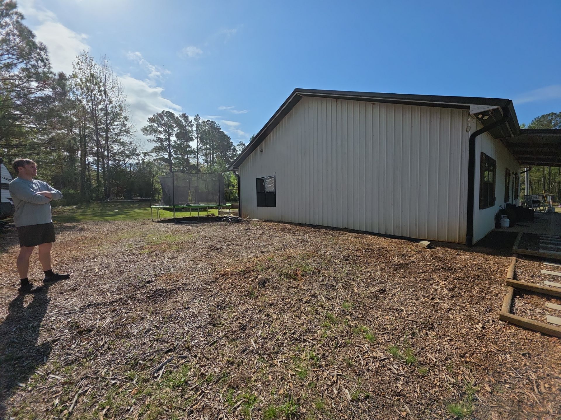 add a concrete pad and carport attached to this building it should almost be the full depth of the building remove the window on the wall and add a door in the middle of the wall the posts are 6x6 lumber and the roof is black ribbed metal