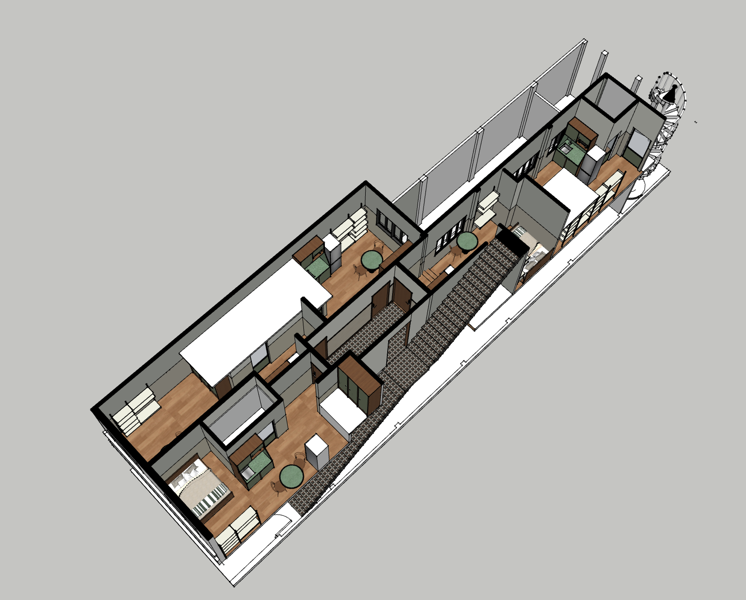 perspective shot convert this model into a realistic isometric 3d view of a full house show the space from an elevated angle with furniture walls and details visible architectural floor plan that makes the existing texture in this image photo realistic follow the texture and colors in the attached image architecture