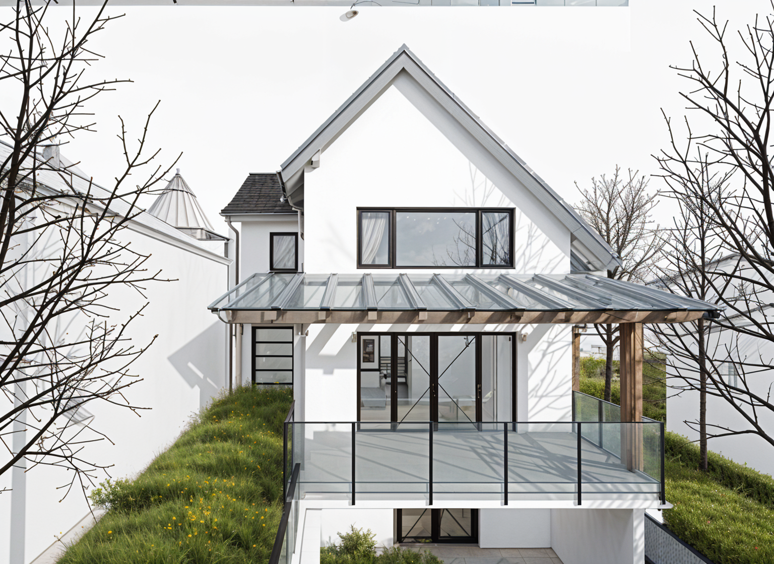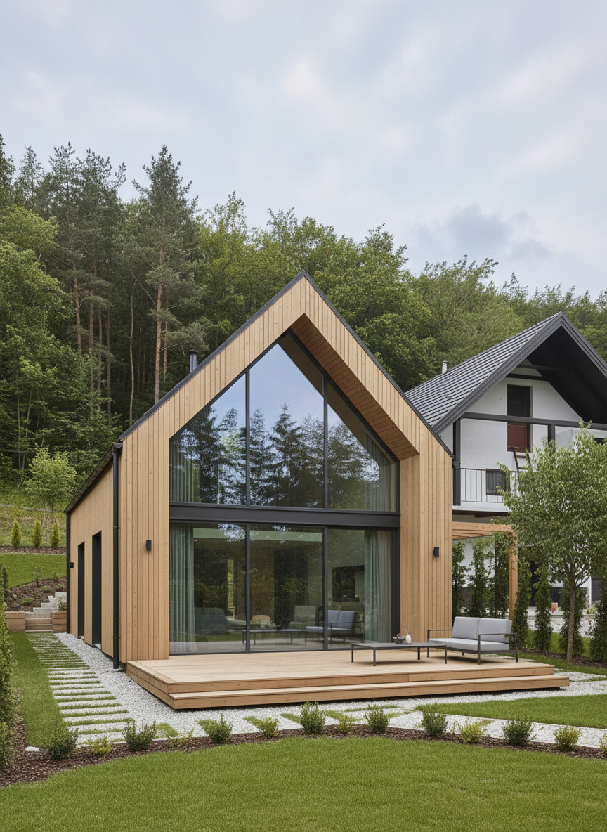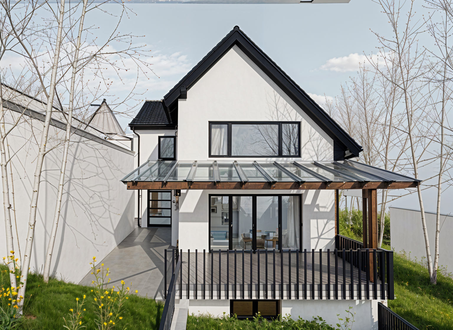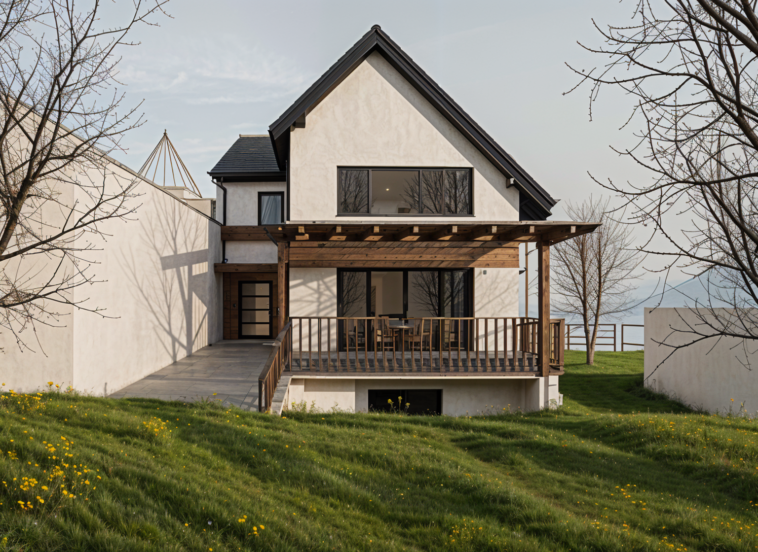modernist exterior shot a beautifully rendered modern minimalist house set amidst a serene natural environment the house features angular wooden structures with a dark gray and black exterior large glass windows reflect the subtle hues of the surrounding landscape the wooden siding has warm earthy tones like soft browns and is combined with sleek contemporary black trimming the atmosphere is tranquil and the lighting is soft mimicking a gentle morning or late afternoon light the ground is adorned with patches of green moss and vivid yellow wildflowers adding a burst of color and life the surrounding trees are leafless drawn with delicate thin black lines indicating the late autumn season shadows of the trees create an intricate pattern on the house and the ground in varying shades of gray and brown the entire setting feels both modern and natural embracing simplicity and elegance architecture white facade without woodwalls