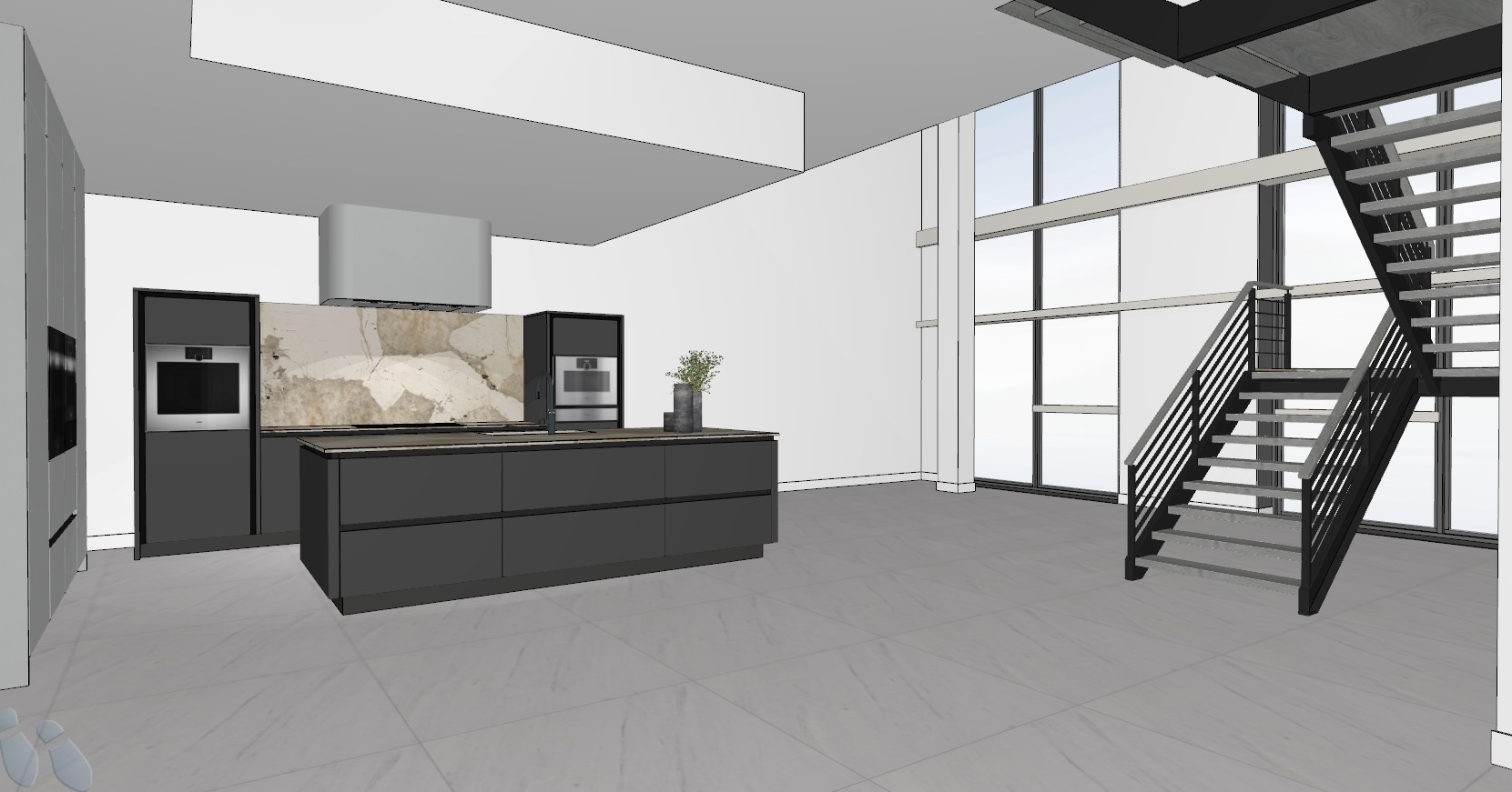 modern minimalist kitchen interior with a sleek design the island and cabinets are a dark charcoal gray and the floors are light gray marble the walls are a concrete effect creating an industrial atmosphere the backsplash is a textured marble with earthy brown and beige tones large windows allow natural light to flood the room enhancing the airy ambiance and the view is a high floor dubai panoramic sunset the staircase has a modern design with black metal railings and white steps a small plant in a gray pot adds a touch of nature the mood is sophisticated and serene with a contemporary color palette