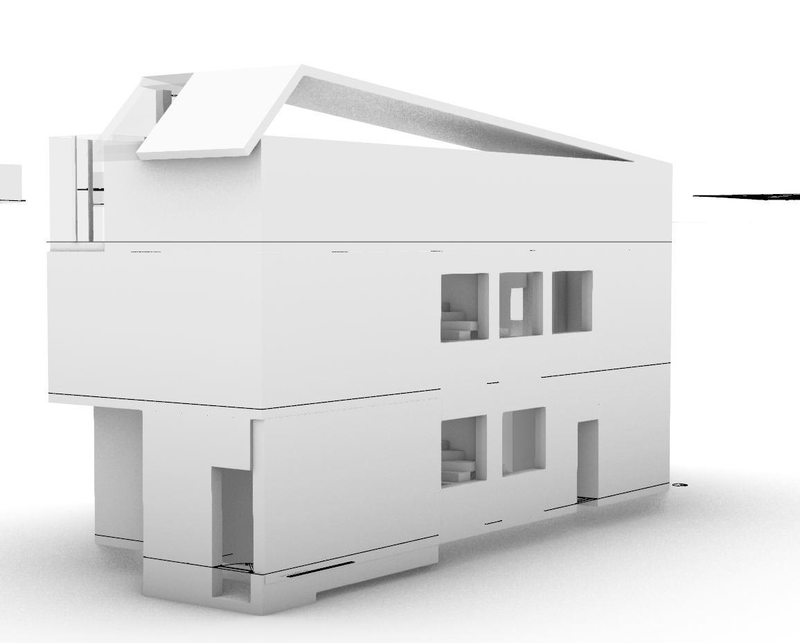 modernist exterior shot make this a render first floor is beige brick second is wood panels and third floor is also beige brick roof is also wood panels architecture