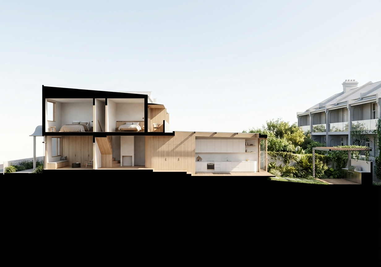 this image is mostly correct remove all the veneer finishes from the top floor balcony and bedroom as well as removing the veneer from the walls and stair of the two ground floor rooms on the left retain the veneer to the central section of the image