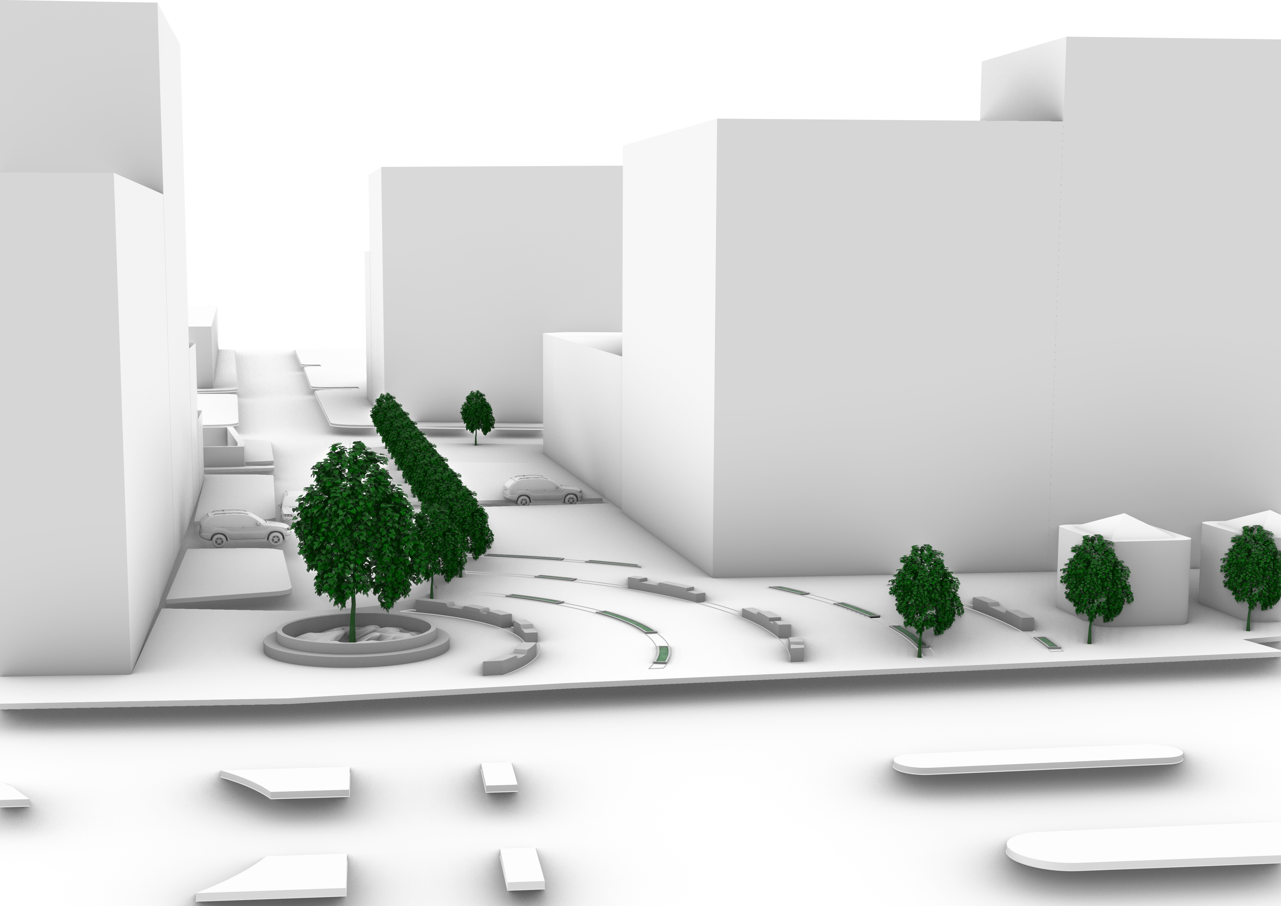 render fotorealistico con piazza pavimentata panche grige e aiuole verdi strada avanti carrabile e asfaltata