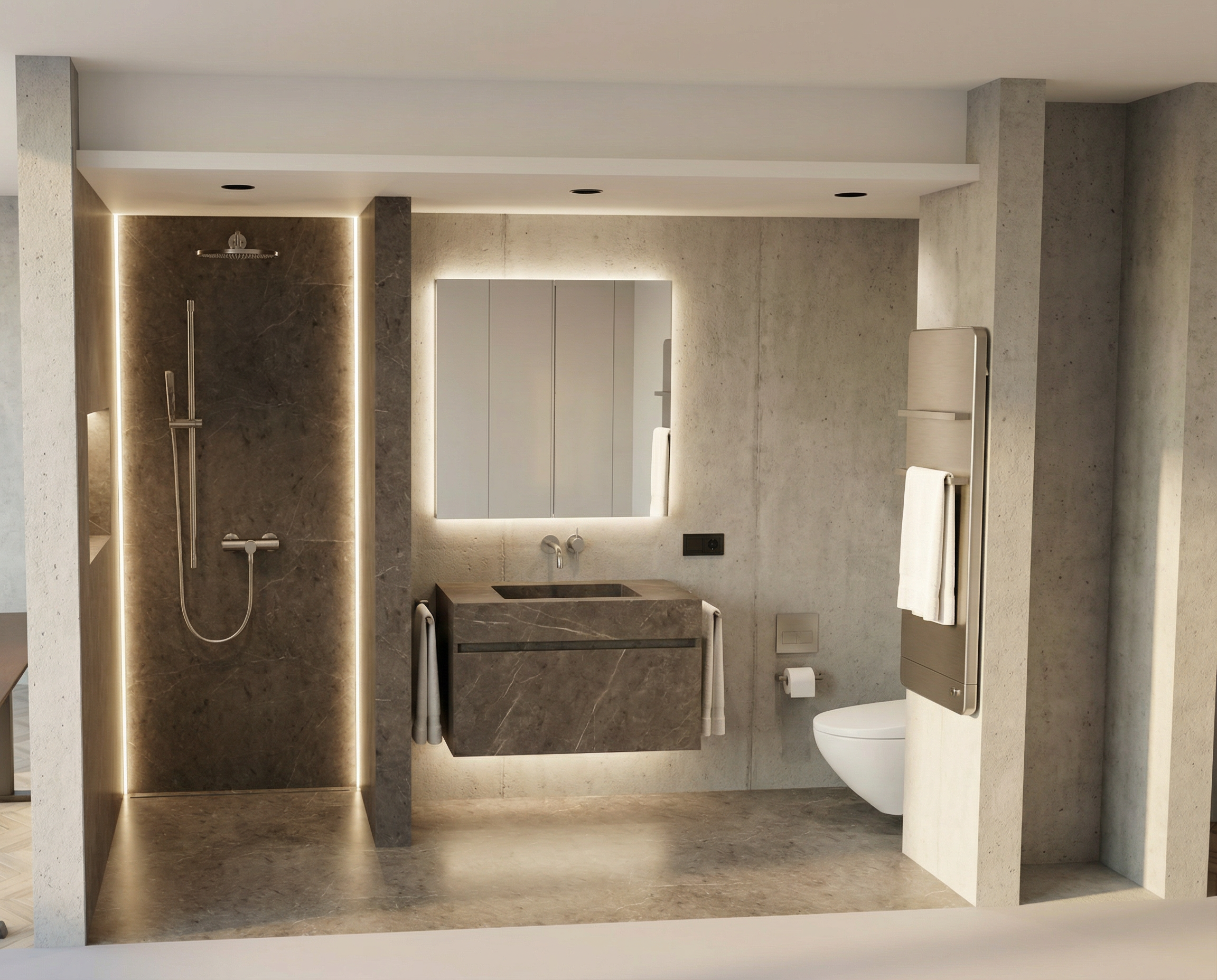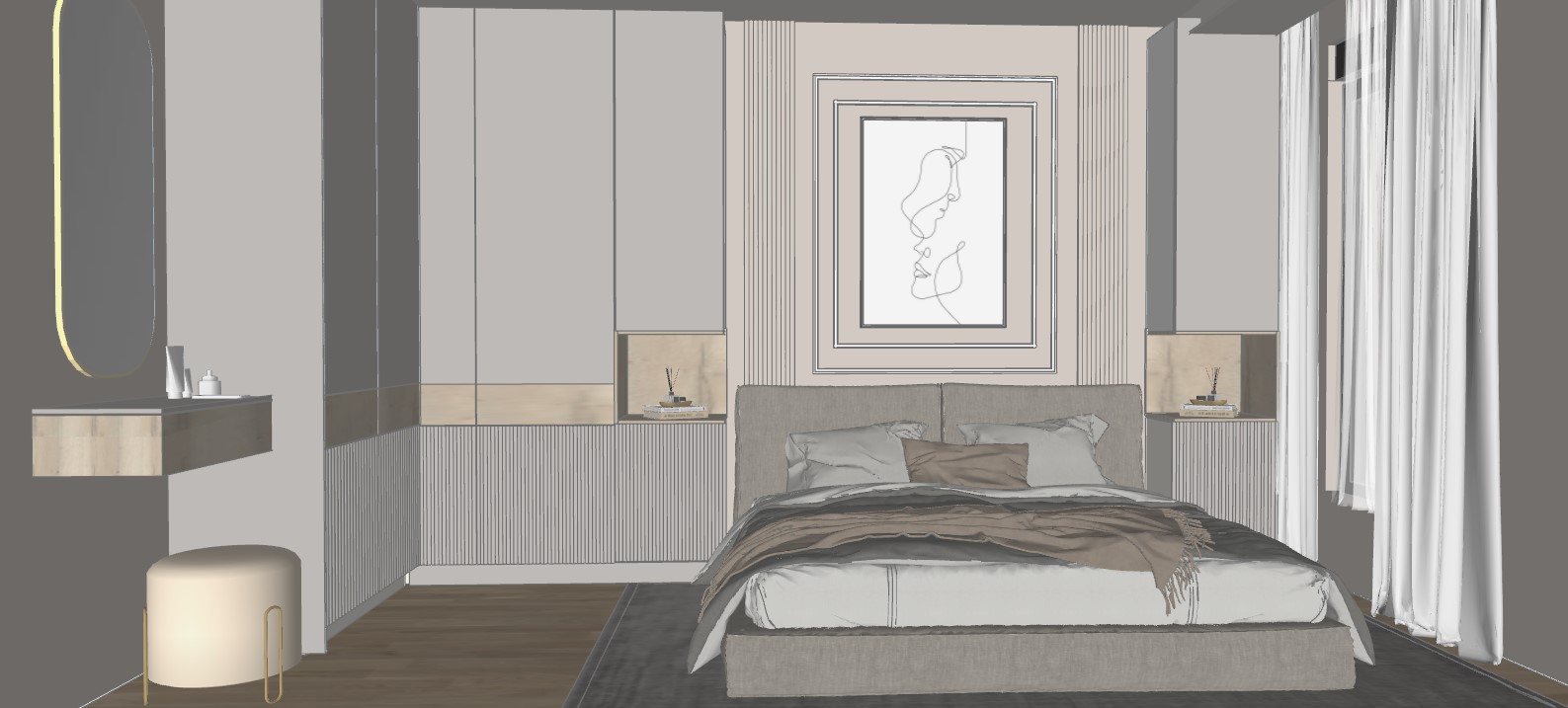 walls are beige sand fronts of the closet are light sand beige and light gentle oak everything like in the sketch soft furniture is warn gentle colors add some modern ceiling light at the center of the room