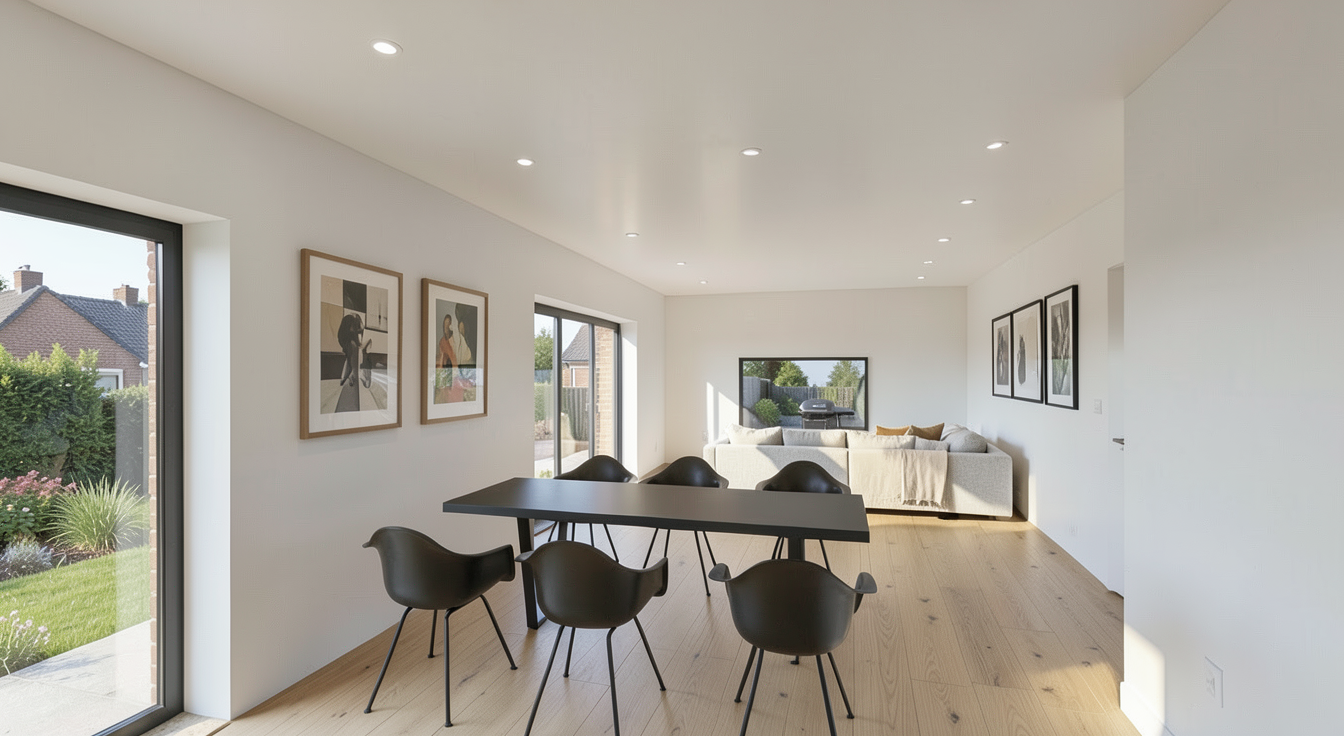 render a classic american two story house with elegant brick texture rich warm brown tones and subtle variations of brick red and soft beige the roof should feature dark charcoal gray shingles adding depth and contrast frame the black windows with striking black shutters use white for the trim and pillars to create a crisp clean look the front door is a deep teal providing a vibrant focal point set the house in a serene peaceful suburban atmosphere with a bright clear sky land descends on right side with a basement garage no sidewalk