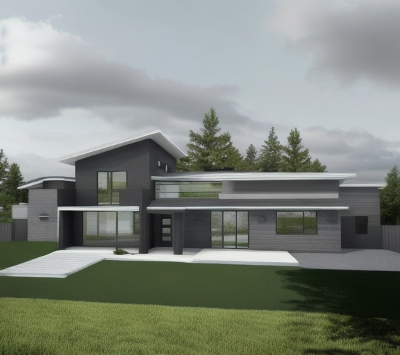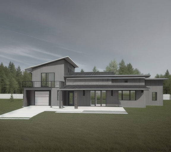 contemporary exterior shot render a modern mountain house with a sleek design under a clear blue sky the walls should be a warm wood tone on the sides and a grey stucco in the center with a black metal roof the windows are large and made of clear glass reflecting the greenery around there should be a wooden deck with a warm brown finish surround the house with vibrant green landscaping and a few delicate flowering shrubs in soft pink and white the atmosphere is serene and inviting with sunlight gently illuminating the facade surround the house with tall coniferous trees architecture