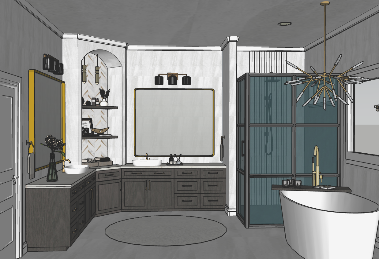 add lights to all the light fixtures add fur to the bathroom rug and some gold black green to the rug make it elevated restoration hardware style bathroom the tile behind the shower head is fluted 3d