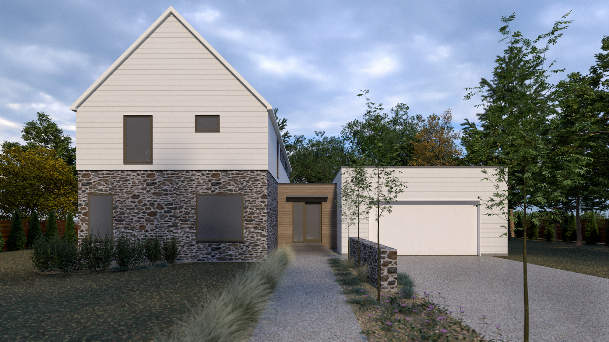 use the uploaded image only as a reference for the house itself preserve the house massing roof forms proportions window sizes door locations and exterior materials remove and replace all existing landscaping ground planes driveways paths walls fences and site elements from the original image do not retain any original planting or hardscape set the house in a walkable northeast united states suburban street with a sidewalk directly in front of the house and a two lane residential street running parallel to the fa ade extending left and right street feels human scaled and established not suburban sprawl new landscape context is simple and regionally appropriate street trees maple oak elm low foundation plantings ornamental grasses and perennials typical of northeast suburbs landscaping is restrained and natural not manicured neighboring houses exist only to the left and right along the same street set back and partially obscured by trees softly out of focus with no visible architectural detail no perpendicular streets no cross streets no intersections and no nearby buildings directly facing the house camera is pulled back to show the full front elevation front yard sidewalk and a portion of the street eye level viewpoint with a moderate focal length no zoomed in framing no cropped fa ade no dramatic perspective maintain painted white horizontal clapboard siding with a natural stone base do not use light wood knotty pine cedar or blonde tones no visible wood knots soft overcast autumn daylight typical of the northeast u s muted fall color palette restrained contrast calm editorial architectural photography atmosphere realistic materials soft global illumination high end architectural competition rendering style do not retain original landscaping original paving original driveway configuration original yard grading or original site context do not introduce dramatic lighting golden hour cinematic effects ultra wide lenses or stylized rendering