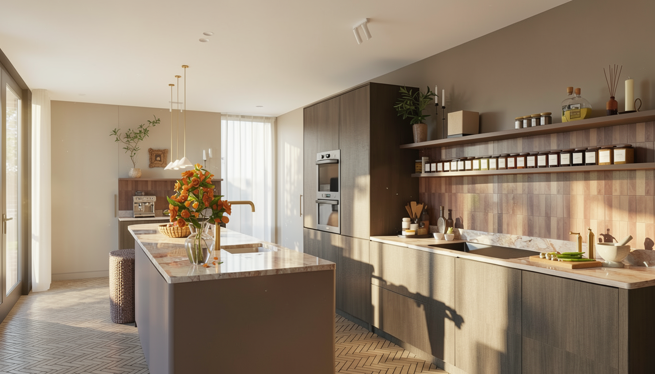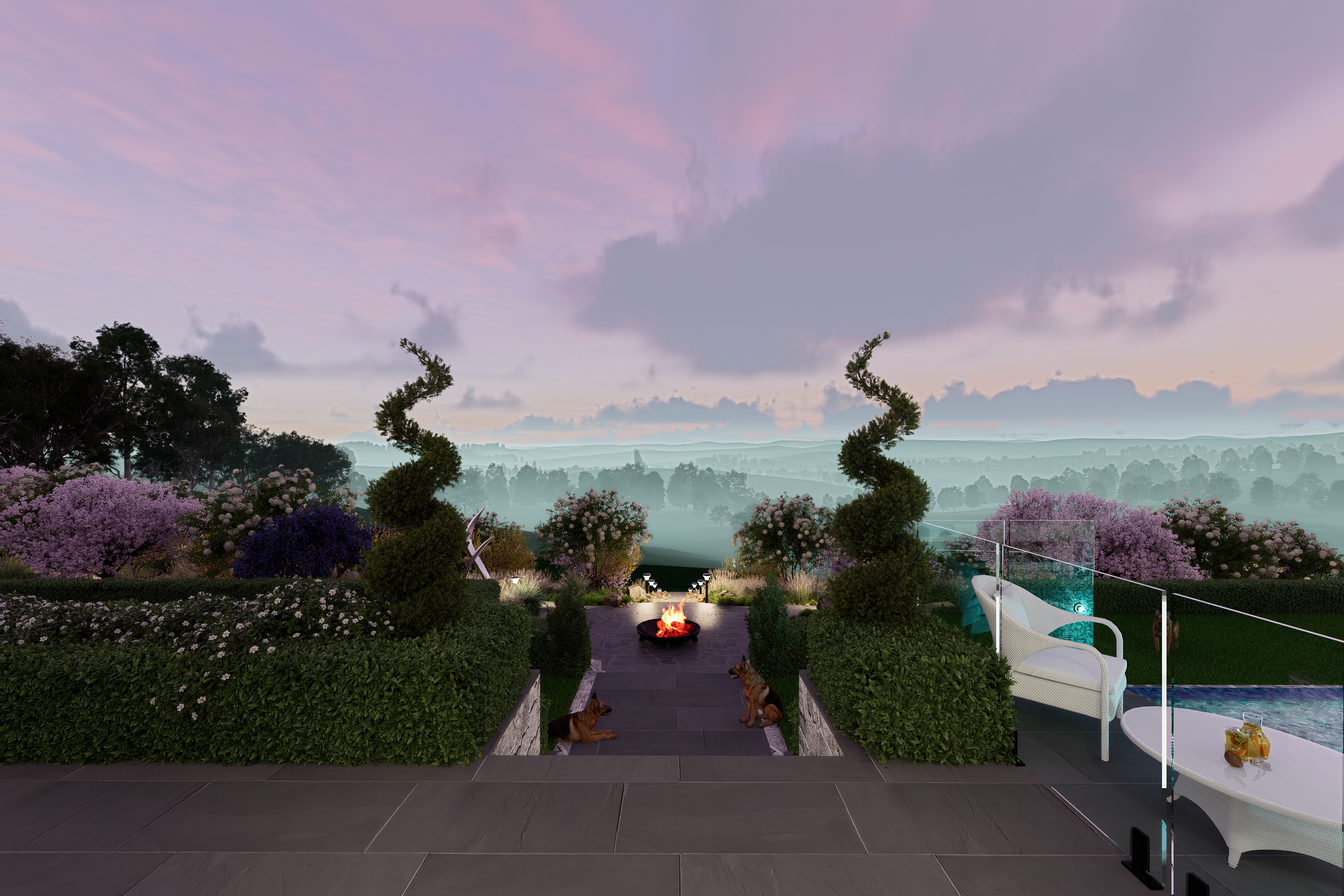 modernist exterior shot enhance existing geometry with hyper realistic materials specify honed mount lofty sandstone with warm textured variations and matte architectural steel floor to ceiling high performance glazing with realistic thickness and slight tint dramatic golden hour lighting low angle warm amber sunlight 2500k 3000k creating long soft edged shadows and high contrast highlights on masonry edges implement deep ambient occlusion in recessed areas professional 8k architectural photography style sharp focus with a clean minimalist aesthetic glazing must feature high fidelity reflections of a lush realistic garden specifically including the soft needle like textures of a deodar cedar bathed in warm sunset light ray traced global illumination high dynamic range hdr color grading zero noise and ultra sharp textural detail architecture