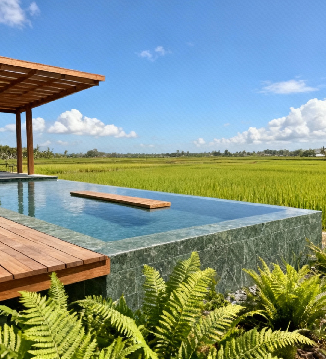change all landscape to ricefields remove all trees to make ricefields until the horizon and under beautiful blue summer sky with white clouds the pool is clad with bali green andesite remove the white wall in the background and make it a timber pergola pavilion plants immediately near the pool are lush ferns in the foreground wooden deck on the left is level with the top of the water pool wood is dark brown black espresso colour the perspective is maintained same as the reference image