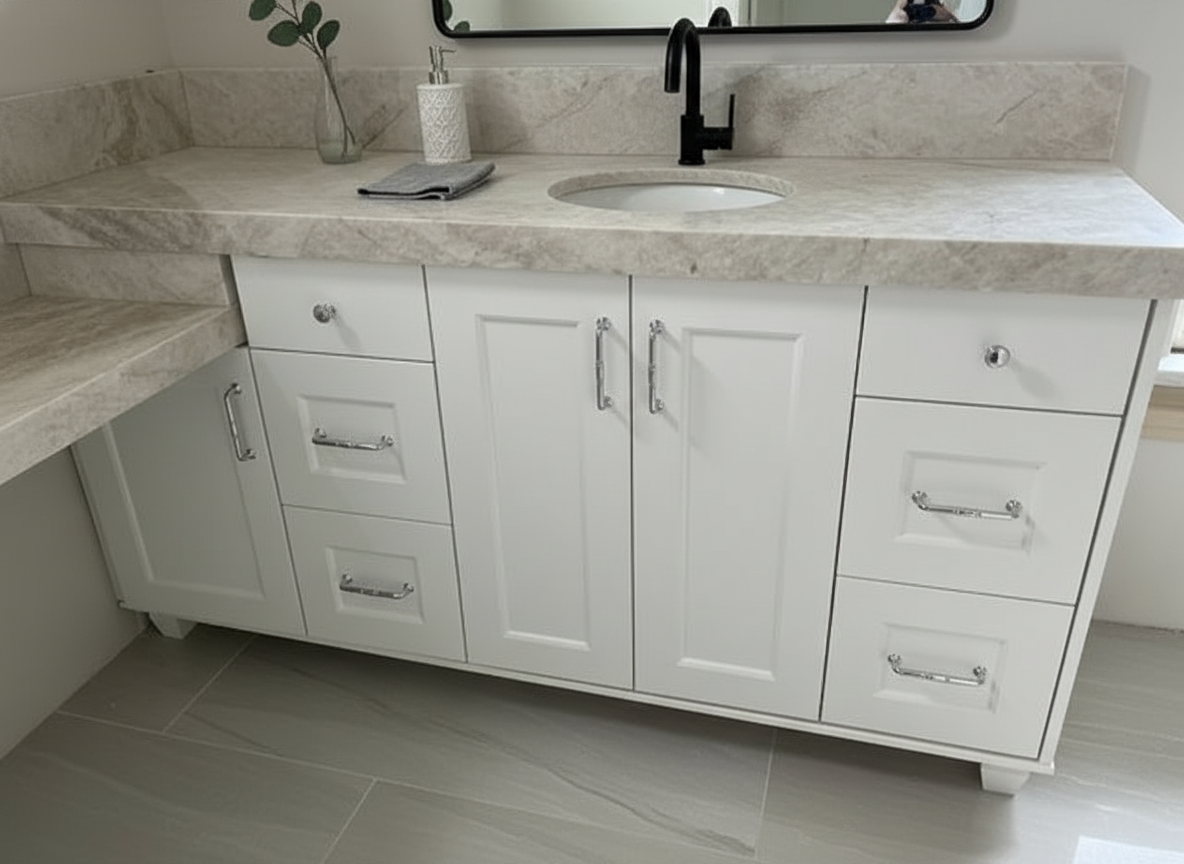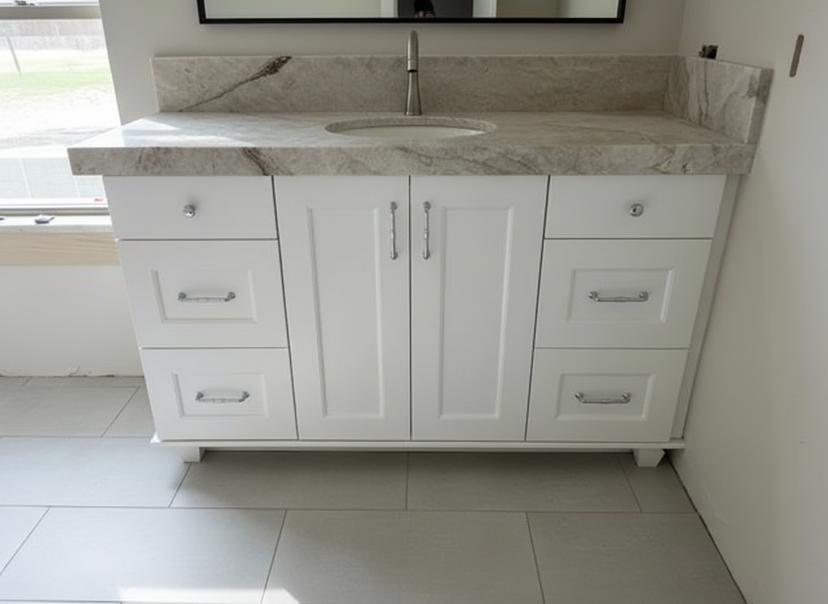 adjust for natural lighting remove everything on the floor add new flooring stage the countertop add a full length mirror above the backsplash