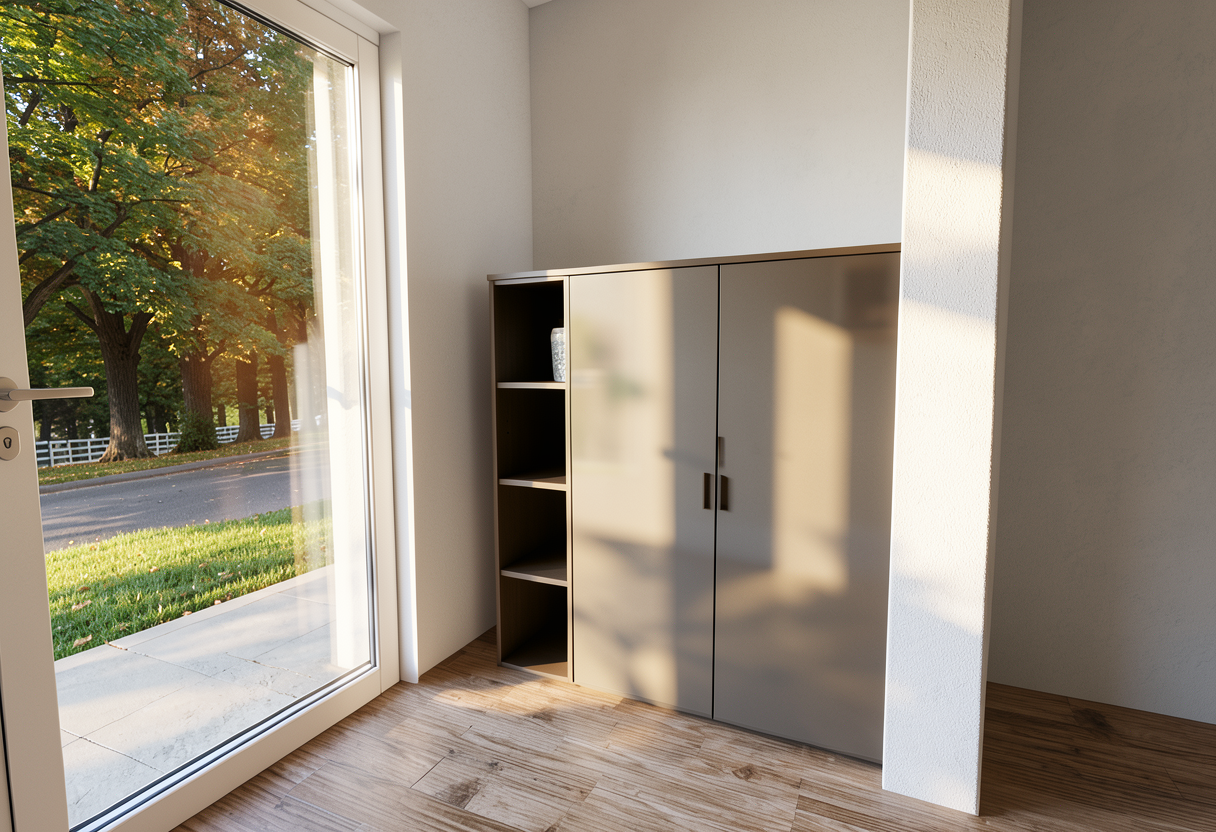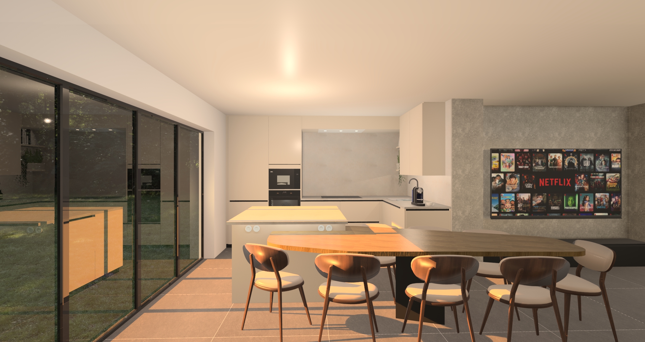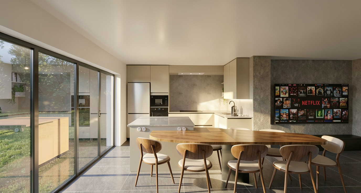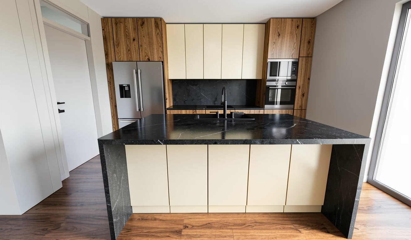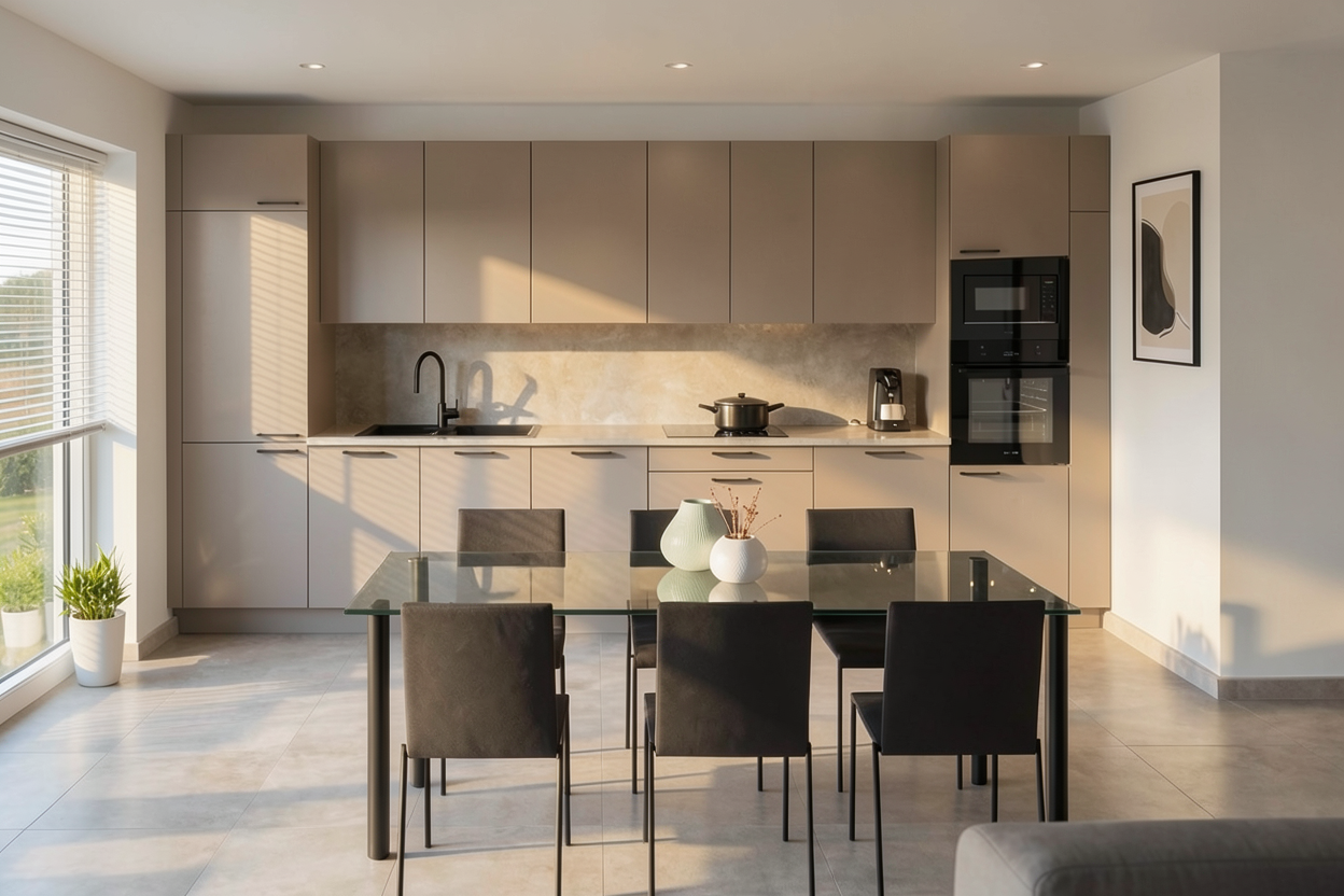 enhance this photo of a kitchen into a professional interior image optimize the lighting so the space appears bright natural and inviting with soft realistic light entry and balanced shadows subtly increase sharpness and clarity correct white balance and colors so that materials such as wood stone metal and lacquer appear true to life and luxurious ensure the overall look is sleek stylish and high end without changing the layout furniture or architecture maintain a realistic appearance refine contrast and details reduce noise and give the photo a warm elegant interior style like in a premium kitchen catalog