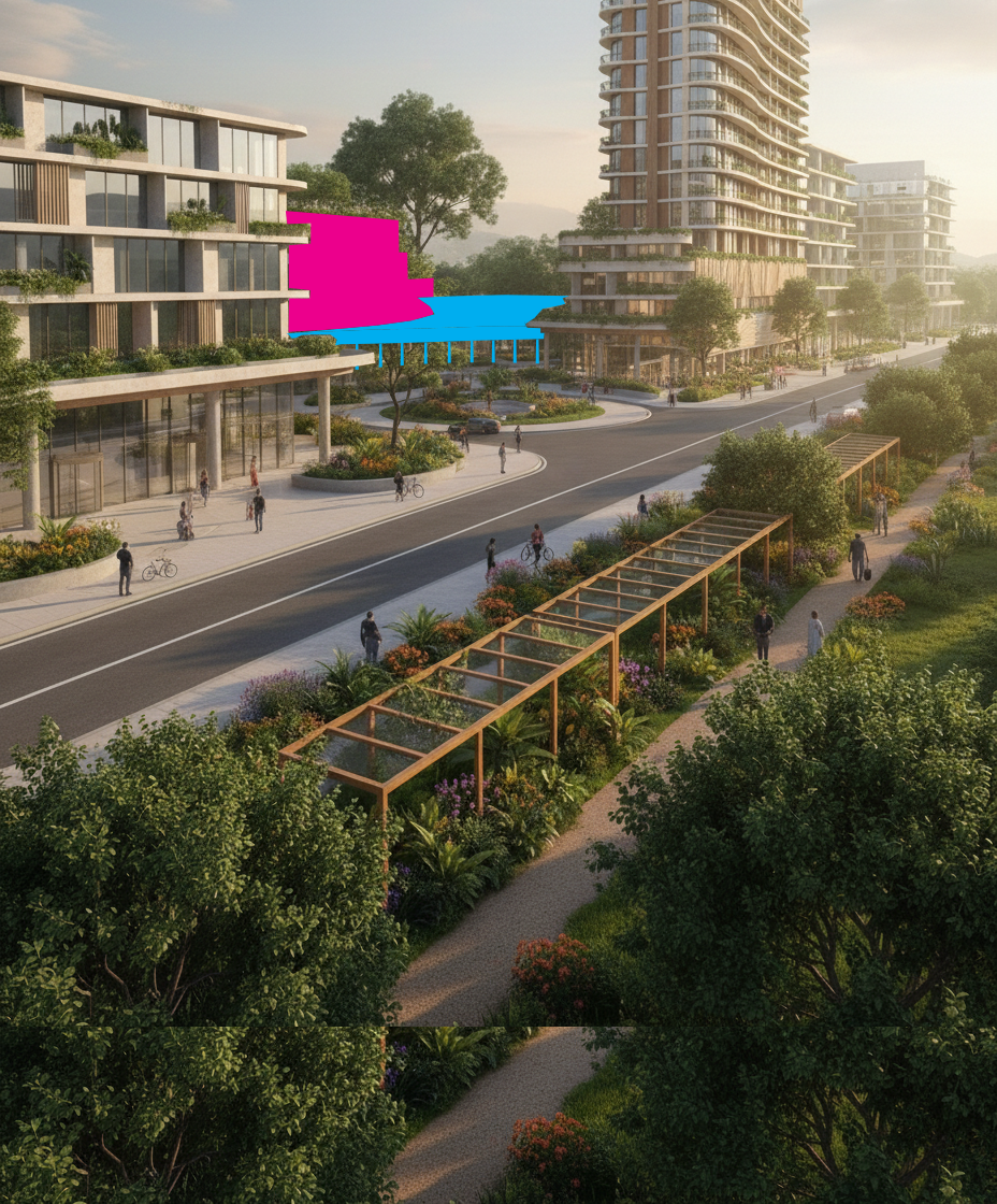 insert an elevated wood and bamboo promenade reference a boardwalk in the defined cyan area only add bamboo columns underneath the promenade marked in cyan too where the pink area is defined insert a commercial building that has restaurants on 3 terraced levels