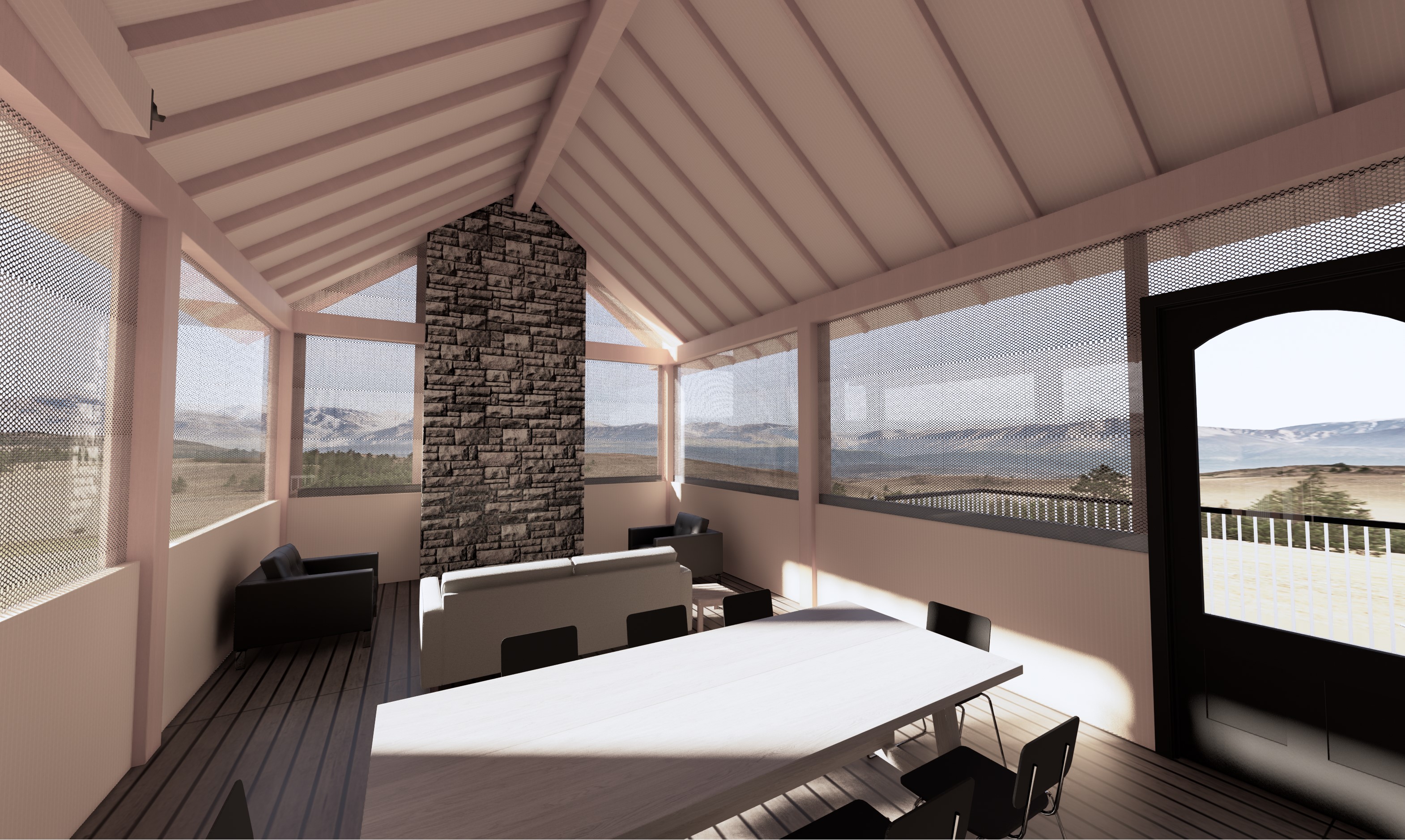 screened in porch limestone brown grey stone add fireplace insert 2x8 douglas fir exposed rafters with wood tongue and groove ceiling place in forest setting