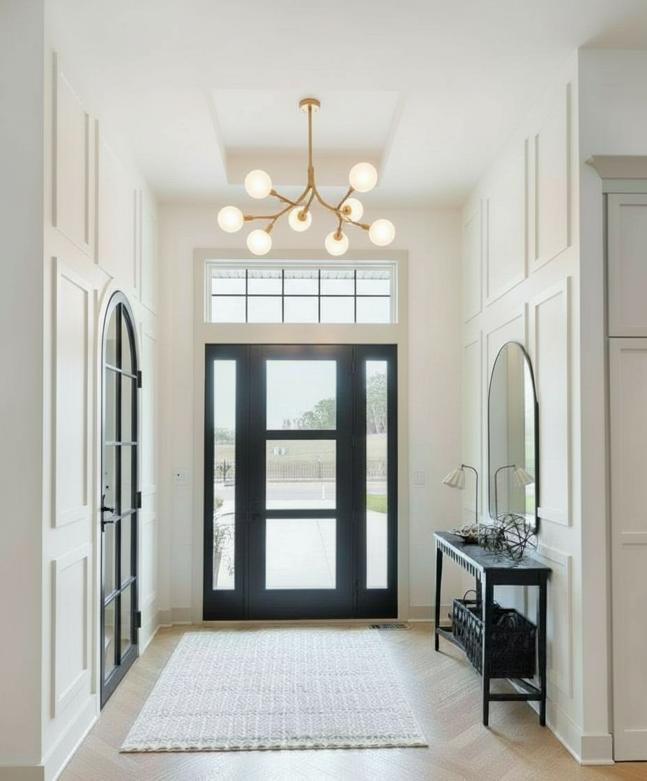 make the green screens behind the bed greet and not gold make bed in earthy deep green colour make floors european oak chevron make wooden wall panelling behind the bed look more textured and reclaimed antique keep the curtains linen like they are but make the thicker like lined at the back the wood wall panelling lost it s luxurious look make look like it s made of antique walnut now it s made of 3 blocks two narrow and one wide in the middle make it 6 same proportions width wise but top rectangles shorter and lower higher add green skirting to match the floors and the cornice 2 shades darker than the walls make the bed in textured boucle keep it s colour