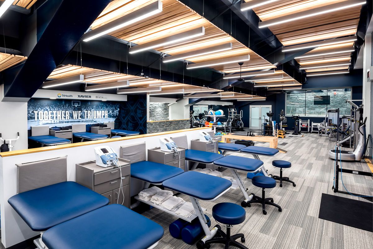 a partir de la imagen adjunta de un athletic training room de un equipo de f tbol americano modifica el dise o interior reemplazando todos los elementos de color azul por una paleta en verde oscuro y blanco que son los colores oficiales del equipo actualiza paredes mobiliario paneles se alizaci n y cualquier elemento arquitect nico que actualmente sea azul para que adopte estos nuevos colores cambia el cielo raso o techo por un dise o m s simple y limpio de color blanco incorporando detalles o acabados en madera natural que aporten calidez y elegancia al espacio asegura que el dise o sea arquitect nicamente correcto bien proporcionado y funcional para un espacio deportivo profesional ajusta y optimiza las luminarias y la iluminaci n general para que sea uniforme eficiente y realista integr ndolas correctamente al nuevo dise o del techo mant n la distribuci n original del espacio pero mejora el realismo de materiales texturas y reflejos para lograr un render fotorrealista de alta calidad
