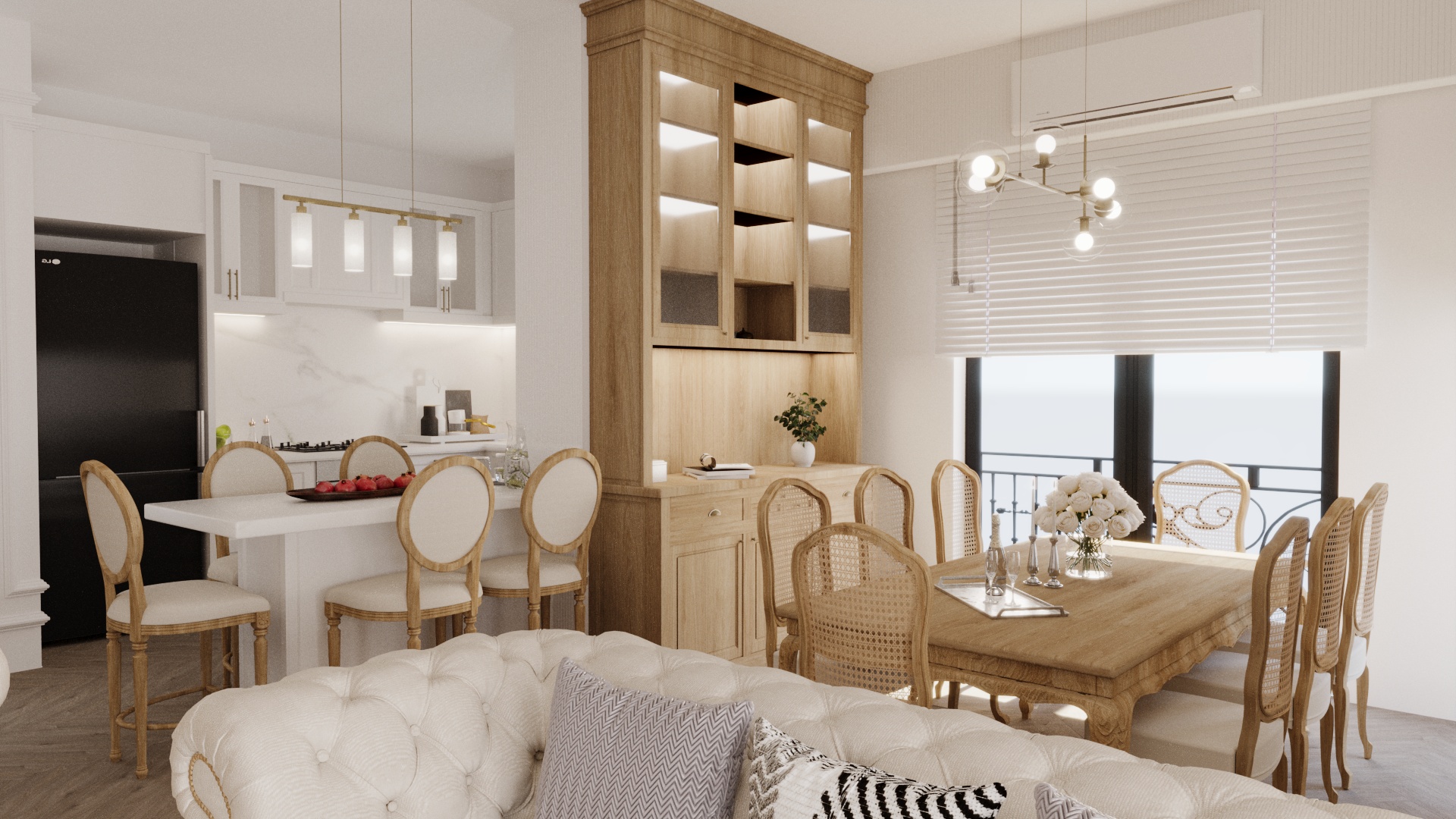 enhance the uploaded interior image for maximum realism while keeping all materials colors object models and dimensions exactly the same realism improvements increase global illumination for a brighter more natural daylight atmosphere avoid dark shadows create a soft balanced light distribution across the kitchen and dining area add realistic reflections and subtle surface highlights without altering textures led lighting turn on all led strips inside the glass front display cabinet shelves every shelf should have a continuous warm white led glow add a soft under cabinet led light beneath the kitchen countertop for a clean and elegant illumination ensure leds look warm daylight tone not too yellow or too cold window outdoor view make the window glass more realistic by adding a visible sky and a subtle outdoor landscape keep it soft and natural not overpowering add gentle daylight rays entering through the window to enhance realism overall look do not change colors of cabinets chairs countertop floor blinds or any object do not modify ebat model or composition only increase realism brightness clarity and lighting quality produce a high end luxury photorealistic result suitable for dilanur topkaya mimarl k
