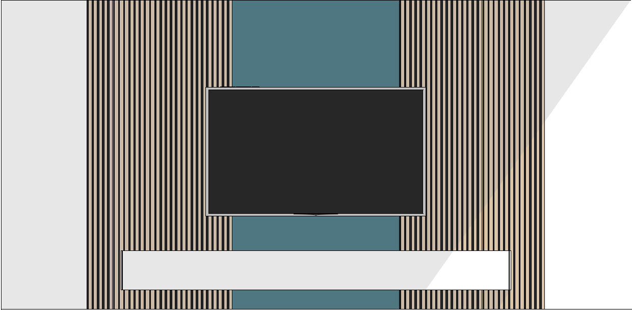 tv wall with a wooden borad simetrical of the tv hiden lights as a stripe on teach side of the wooden panels under the tv there is a 3 m lond standing shelf from the sids of the tv there is a indor plant
