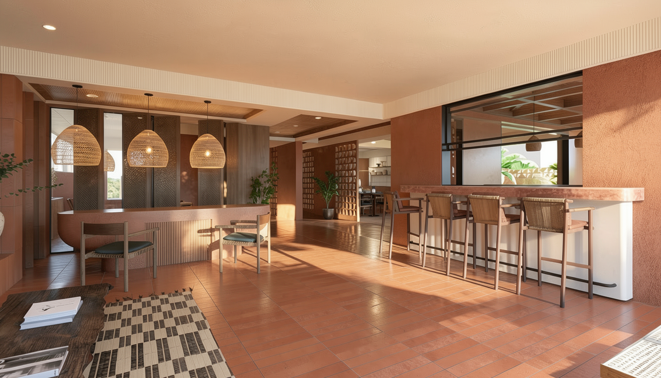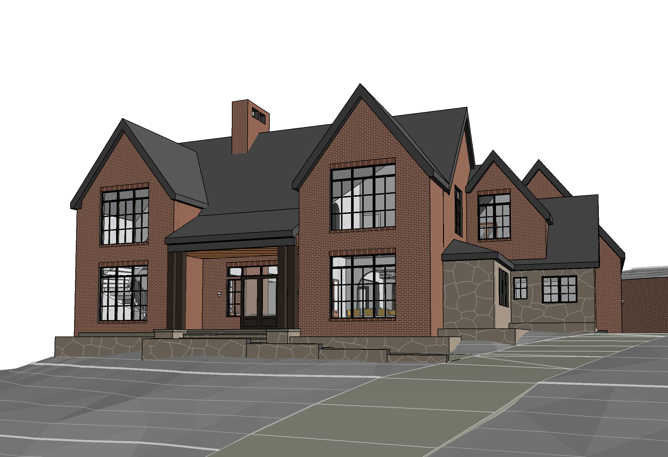 make a rendered elevation with old red brick and grey tennessee flagstone add bushes to the raised gardens and make the front slope have grass