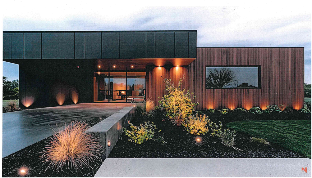 exterior shot lightly wooded lot with a home in the background about twenty feet away autumn colours on trees subtle short very modern landscaping