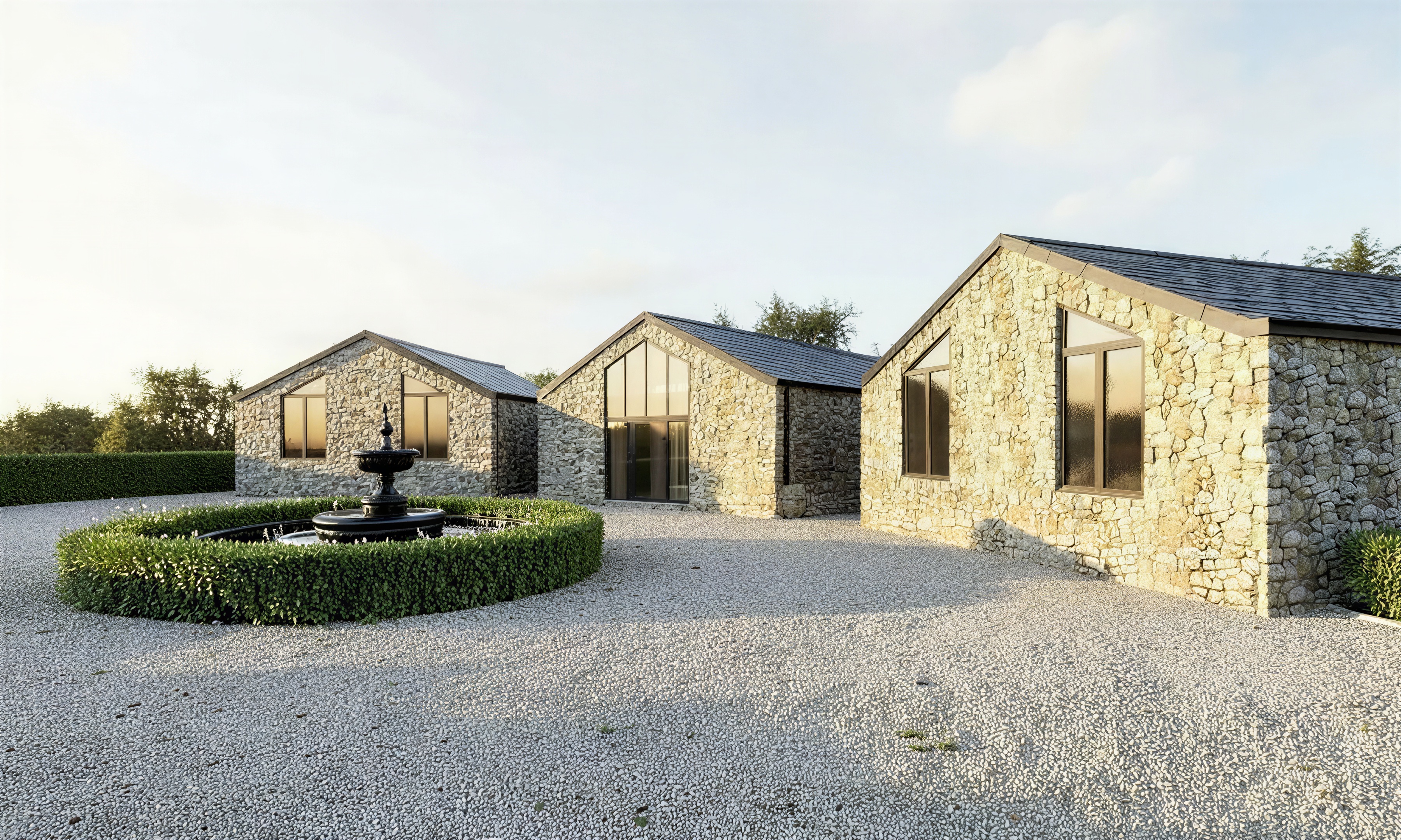 keep this image the same but give me a night version add some lights lighting up the fountain and some wall lights evenly spaced on the front elevations add a glow coming from inside the windows