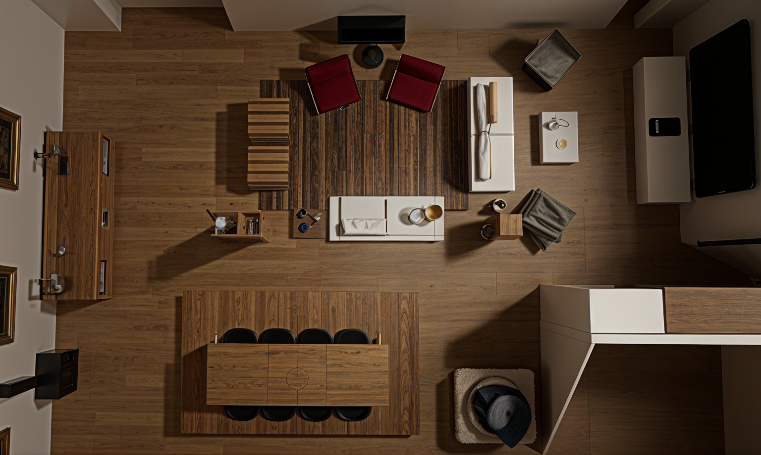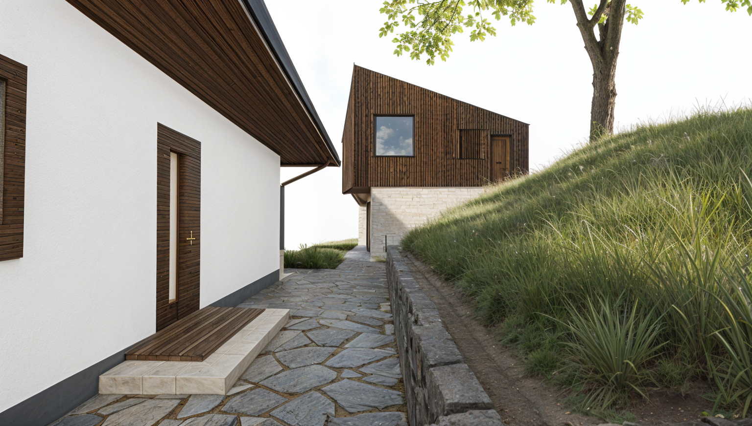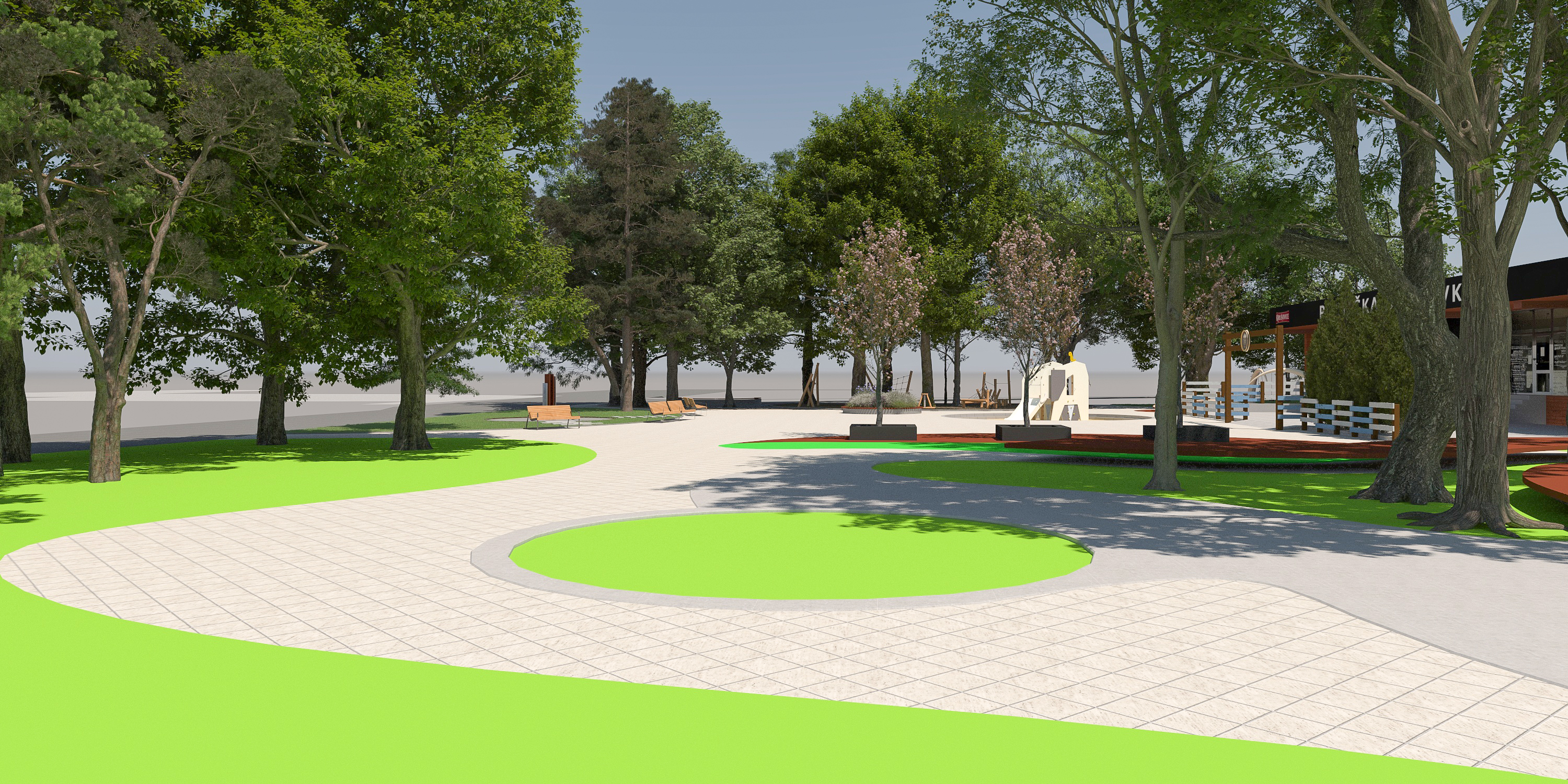 make this photo more realistic instead of the paving put there compact gravel material add grass instead of the green area in the middle in the green circle put there wooden platform patio with tree in the middle edit all trees to look more realistic the blue background is not sea there should be road and buildings in the back