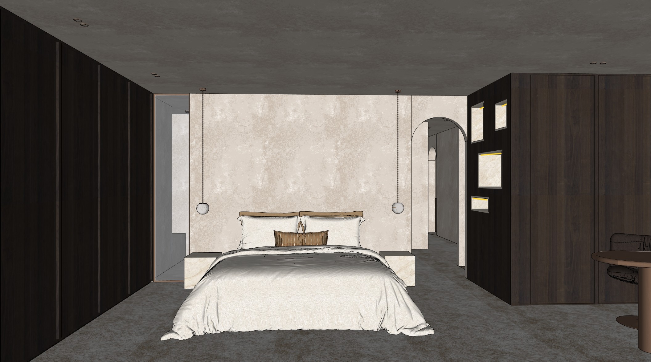 high end bedroom arch view taj mahal stone bronze details archsynth maintain precision strict camera match maintain precision 4k photorealism pbr only no redesign no model changes create a 4k ultra photorealistic architectural interior render based strictly literally and only on the uploaded reference image this exact bedroom viewpoint this is an existing built interior the reference image is authoritative and final all geometry layout proportions wall positions ceiling planes cabinetry bed side tables open niches arched opening corridor furniture models lighting positions and circulation must remain 100 identical to the reference image no redesign no reinterpretation no repositioning no added or removed architectural elements no camera changes treat the image as a camera matched architectural backplate camera absolutely locked exact same camera position height and distance same framing and crop same axial two point perspective architectural lens 24 28 mm perfect verticals no distortion architecture locked bed position headboard wall and proportions identical arched doorway behind the bed identical open niches on the right identical in size and position built in cabinets left and right identical no rounded wall corners no rounded ceilings no visible seams joints or panel lines walls and ceiling read as continuous monolithic plaster surfaces walls ceiling ton sur ton plaster pbr decorative mineral plaster paint technique walls and ceiling use exactly the same material structure and color ton sur ton palette matte not flat visible micro texture and subtle relief realistic light interaction led strict location only led strips only where the yellow lines are indicated in the open niches on the right color temperature exactly 3500k indirect architectural glow led source not visible no extra leds no led in ceiling no led under furniture stone taj mahal quartzite critical applies to both night tables solid block volumes open niches on the right fully clad any stone detailing shown in the reference stone properties white quartzite with soft golden veining satin finish subtle translucency light penetration natural depth and mineral variation realistic reflections bed textiles bed geometry and proportions identical upholstery beige linen color identical to reference clearly visible linen weave natural soft folds bedding beige linen sheets identical to reference natural creasing and weight cushions front cushion striped identical pattern and scale as reference rear cushions bronze brown boucl clearly visible looped fiber texture soft volume matte appearance rug updated position and shape identical color beige identical to reference semi high pile clearly visible fibers soft light absorption chair model identical to reference upholstery dark brown leather natural leather grain and patina legs base bronze finish subtle metallic reflections table shape and proportions identical finish mortex color bronze brown identical to reference matte mineral texture with subtle depth cabinetry framed doors critical cabinets left of the bed framed doors cabinets right of the open niches framed doors frame thickness exactly 15 mm dark veneer tone identical to reference no slab doors window view window position and size identical frame finish bronze exterior view looks into the bathroom shower head subtly visible shower hardware in bronze bathroom softly lit bathroom visible through window shower area softly illuminated warm indirect lighting bronze fixtures readable no over brightness corridor behind arch fully carpeted floor walls and ceiling identical plaster finish as bedroom same color and texture as reference even lighting lighting natural functional daylight primary natural daylight enters from behind the camera diffuse soft daylight no direct sunlight even calm exposure no harsh contrast pendant lights bedside pendants identical to reference emit warm light color temperature 3500k cables bronze soft glow on stone night tables ceiling spots spots actively emit light visible realistic light cones soft fall off color temperature 3500k open niches decor minimalist books only neutral tones natural placement no extra objects material realism global pbr only all materials must clearly show texture relief roughness variation realistic reflections physical light interaction flat materials generic shaders plastic look negative prompt design changes geometry changes camera changes altered furniture models missing taj mahal stone blocks slab cabinet doors wrong cushion fabrics wrong rug color or pile smooth plaster flat stone glossy stone wrong metal color missing led in niches extra leds wrong color temperature cinematic lighting direct sunlight blur haze fog bloom noise people clutter game engine look