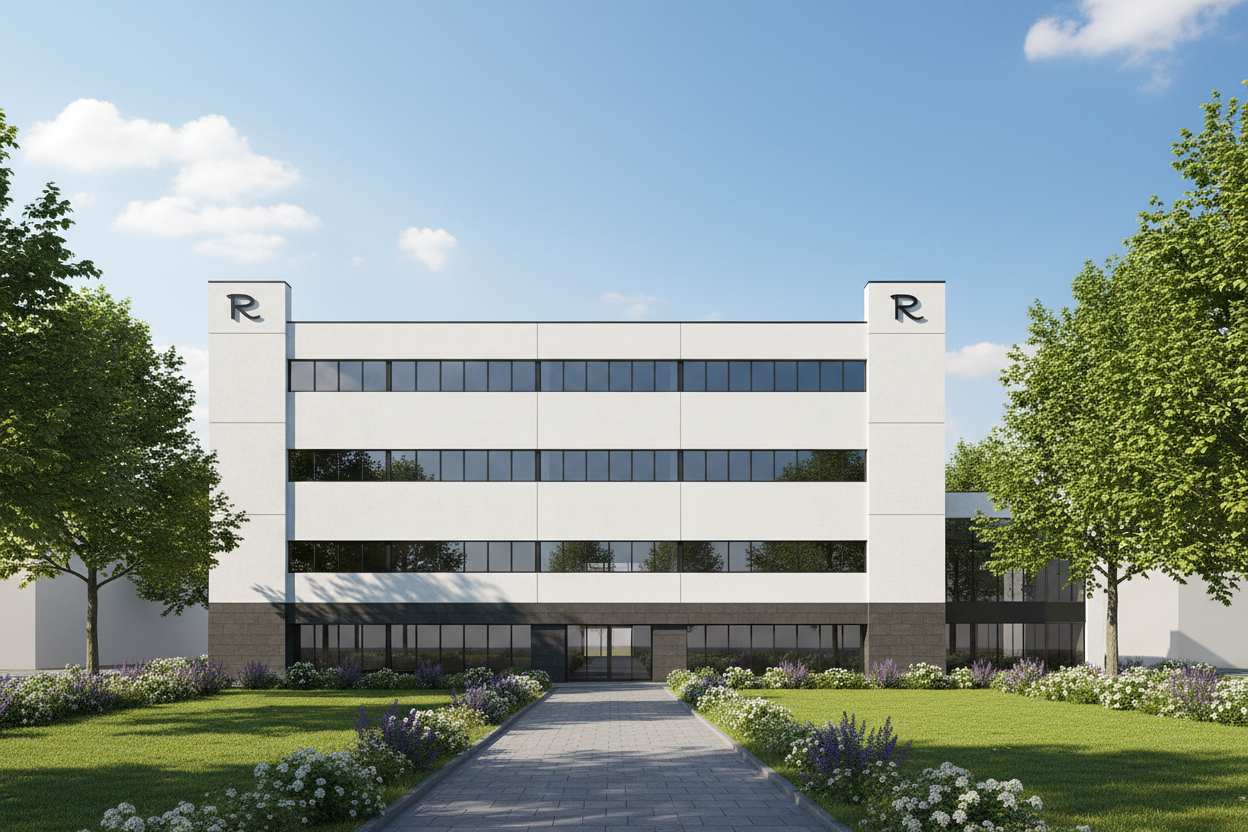 render a modern four story office building with a minimalist sleek design the fa ade is painted in a clean white color the windows are large and tinted with a reflective black finish a paved pathway leads to the entrance lined with neatly trimmed green grass and lush purple and white flowers the scene is set during the daytime with a clear blue sky and a few fluffy white clouds tall vibrant green trees are symmetrically lined along the property creating a serene and inviting atmosphere