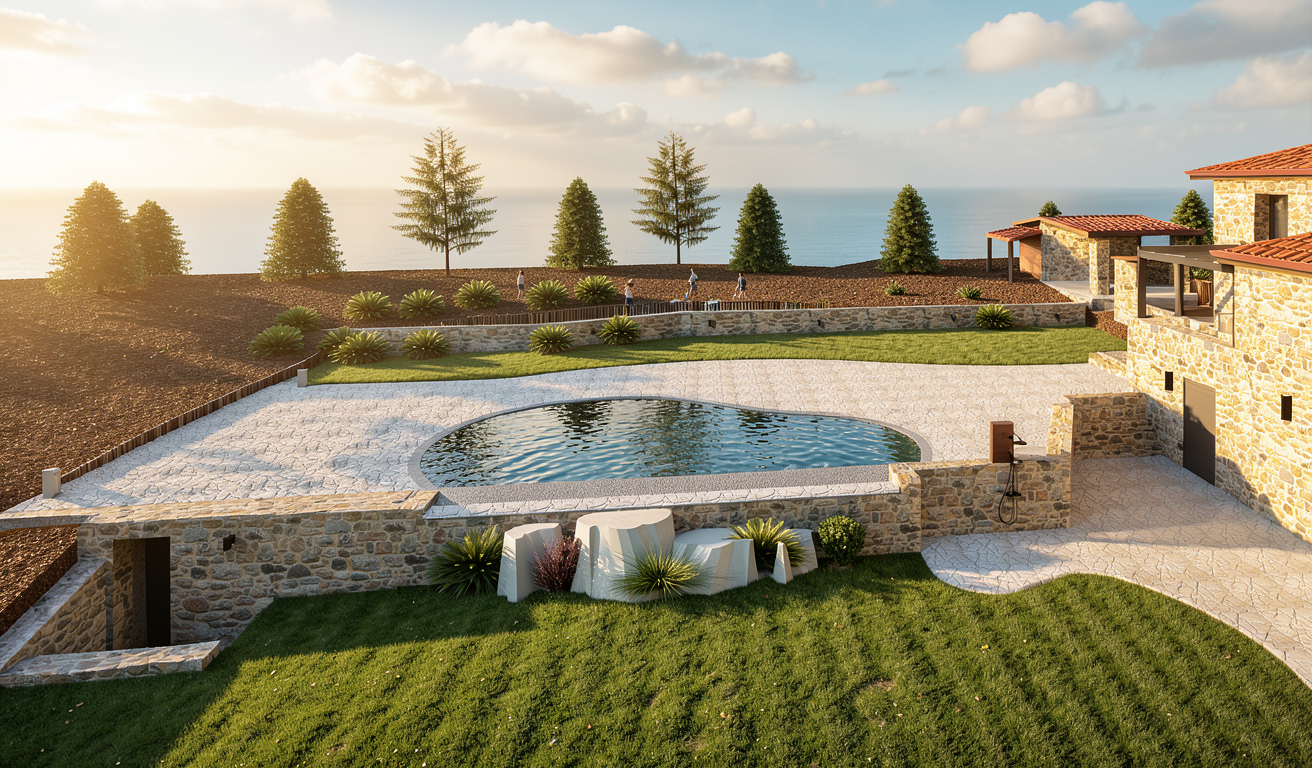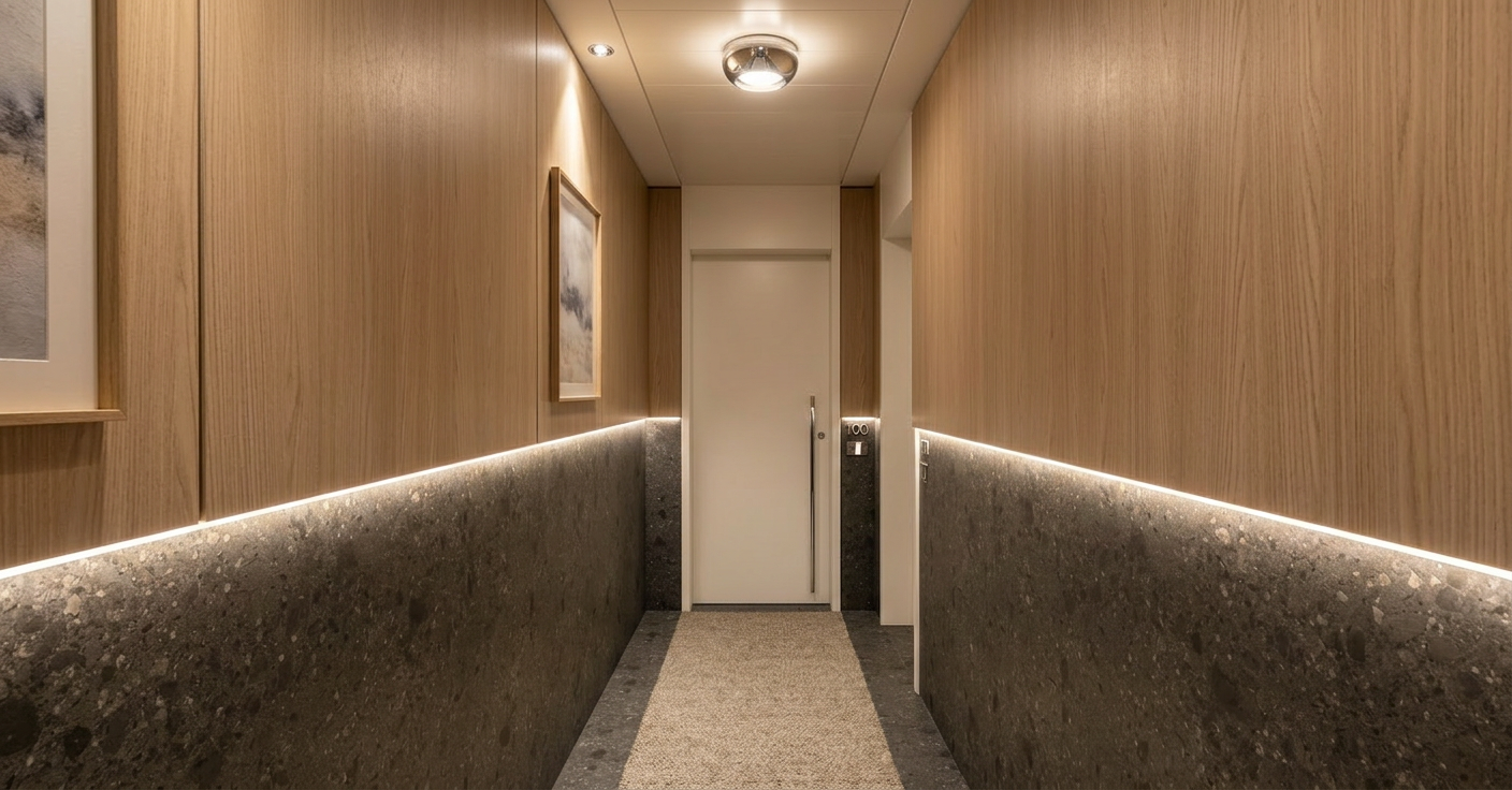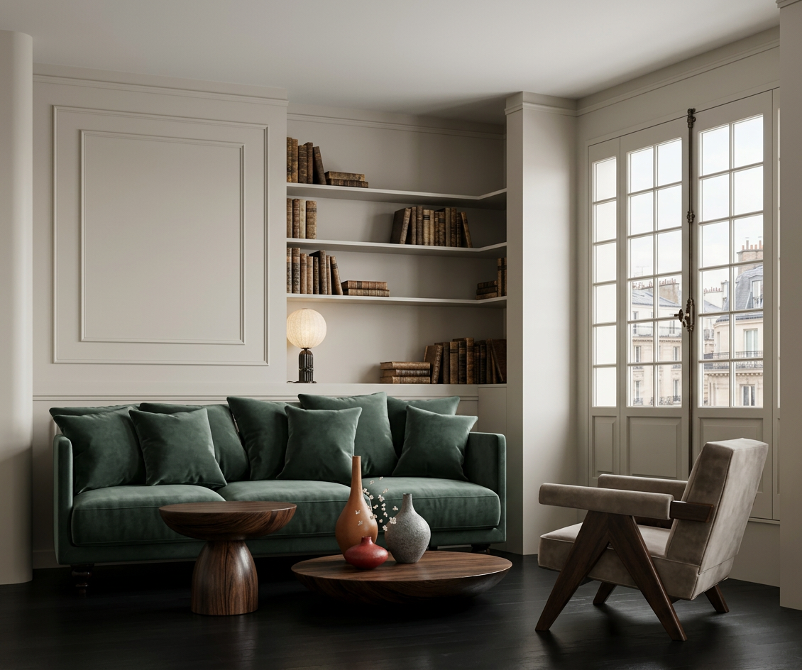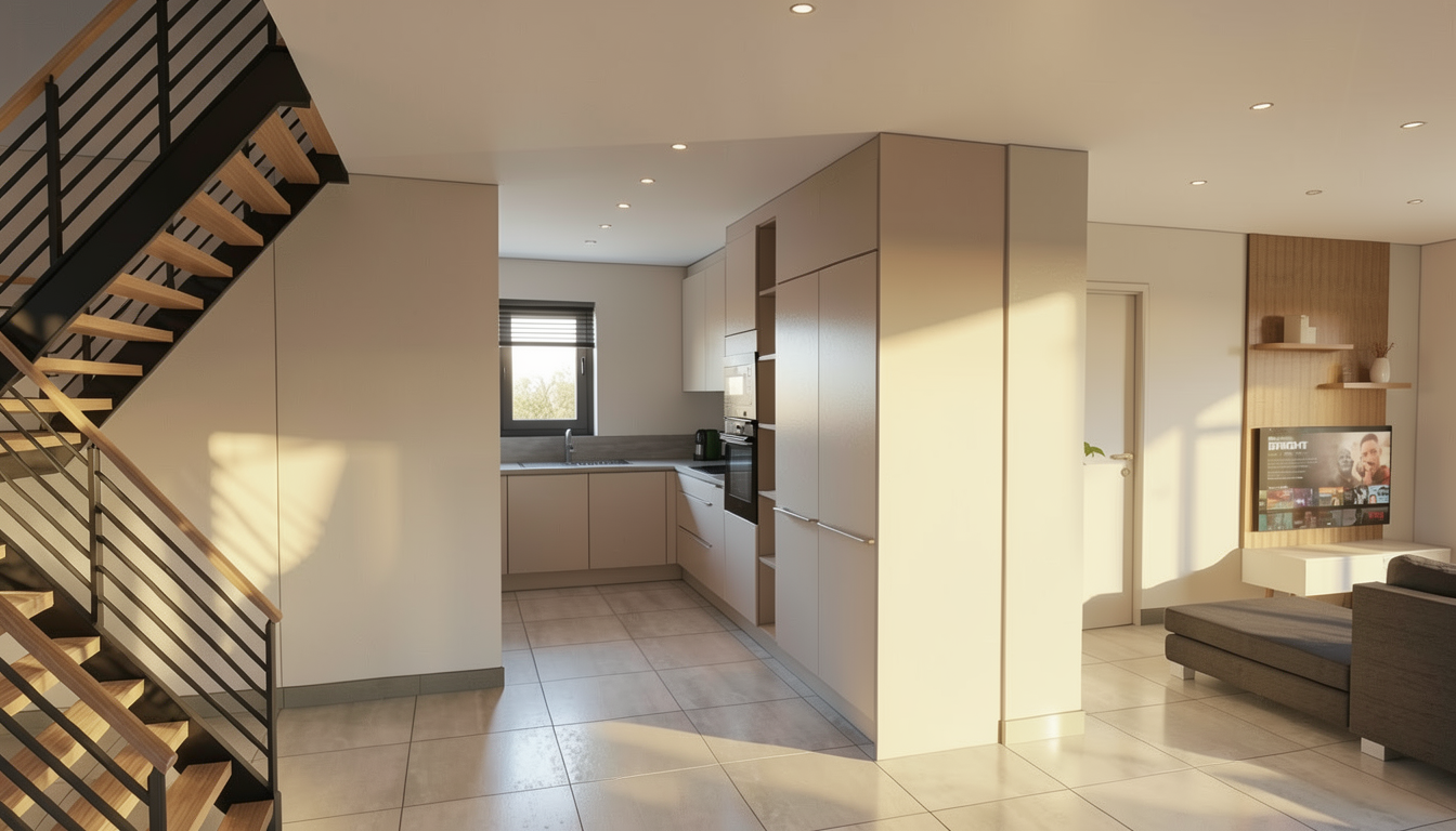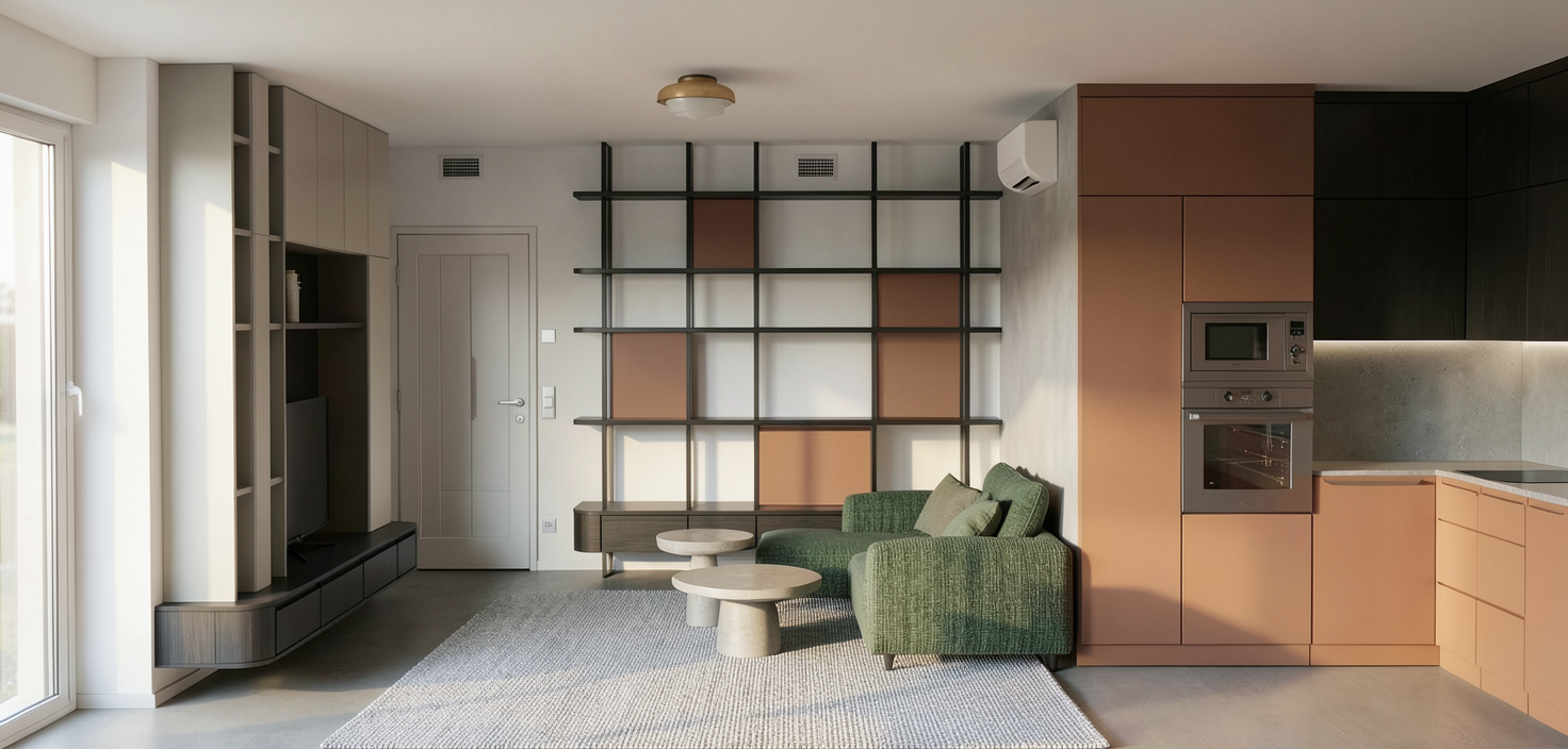 use the provided image as the base composition and camera angle preserve the layout proportions furniture positions and architectural elements exactly as in the reference image do not change the camera perspective room geometry furniture placement cabinetry layout or architectural elements convert the scene into a highly realistic interior render of a modern living room connected with a kitchen the space is illuminated by natural daylight entering from the window on the far left producing soft realistic shadows and natural interior lighting living area center right on the right side of the living space place a medium dark green fabric sofa with a rich woven textile texture the fabric should have visible fibers and a natural matte appearance the color is a deep muted green elegant and slightly desaturated under the sofa is a light gray rug with a clearly visible woven fiber structure the rug should look soft and tactile with subtle texture variation the two coffee tables in front of the sofa are made from light warm toned concrete with a matte surface and subtle material imperfections typical for cast concrete kitchen right side the kitchen cabinetry is terracotta colored with integrated milled handles finger pull grooves following the exact geometry of the reference design include a built in oven and microwave stacked vertically inside the tall cabinet the upper kitchen cabinets on the right side are made from black stained wood with a subtle visible wood grain the countertop is light gray natural stone with a matte finish and delicate natural stone variation kitchen backsplash and wall finish the wall behind the kitchen countertop is finished with smooth concrete microcement plaster betonov st rka this surface must be continuous and seamless without joints tiles panels grout lines seams or modular divisions important material rules no tiles no ceramic backsplash no stone slabs no panel joints no tile grid pattern no visible seams the surface should look like hand applied architectural microcement plaster with subtle tonal variation very fine concrete texture and a soft matte finish the backsplash should visually read as one continuous plaster surface applied directly on the wall the side panel of the tall kitchen cabinet is finished with the same concrete microcement plaster visually connecting with the backsplash and creating a consistent material language wall behind the sofa the wall behind the sofa is also finished with the same smooth concrete microcement plaster to create material continuity at the top of this wall place a wall mounted air conditioning unit behind the sofa there is also a small service door outline that is completely flush with the wall and finished in the same plaster so it blends seamlessly into the surface back wall with shelving system the shelving unit is made from black stained wood with a grid structure inside the shelving grid are rectangular panels in the same terracotta color as the kitchen cabinetry at the bottom of the shelving unit there is closed storage with drawers that feature the same integrated milled handles as the kitchen the wall behind the shelving unit is white plaster near the top of this wall place chrome ventilation grilles tv wall left side the lower section of the tv wall is black stained wood cabinetry with drawers and integrated milled handles the upper cabinets are light beige inside the shelves there are led strips mounted on the underside of the shelves creating soft indirect lighting the back panel behind the television niche is black stained wood window far left a large window allows natural sunlight to enter the room and illuminate the materials realistically ceiling and lighting the ceiling is smooth white plaster a ceiling light fixture made from opal glass with a gold upper detail emits soft warm ambient light door and hallway the door into the room is glass through the door the entry hallway is visible containing a wardrobe in a subtle warm pink color rendering style ultra photorealistic interior visualization architectural visualization quality physically accurate materials natural lighting global illumination soft shadows high material detail subtle imperfections architectural photography style 8k detail