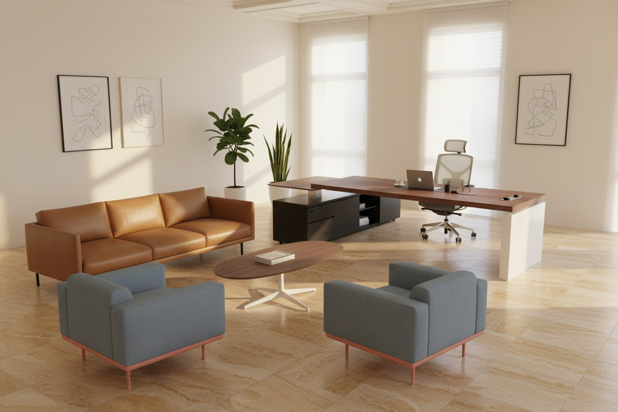 a photorealistic italian designed executive manager office with warm travertine marble floors and cream plaster walls center l shaped executive desk with rich walnut wood grain tabletop matte black storage cabinet white metal slab legs behind desk high back white mesh ergonomic chair with headrest gray cushioned seat black armrests white five star caster base left side three seater cognac caramel full grain leather sofa with clean boxy silhouette and slim black metal legs opposite pair of boucle blue gray fabric armchairs with salmon pink powder coated metal frames flanking an oval walnut veneer coffee table with white four spoke star base venetian blinds cast dramatic linear shadows across the space warm golden afternoon light streams through windows 2 3 tall slender indoor plants fiddle leaf fig and snake plant elegantly placed minimalist wall art coffered ceiling details slight wide angle eye level perspective capturing full room depth sophisticated refined aspirational atmosphere architectural visualization quality