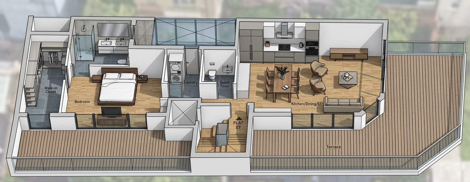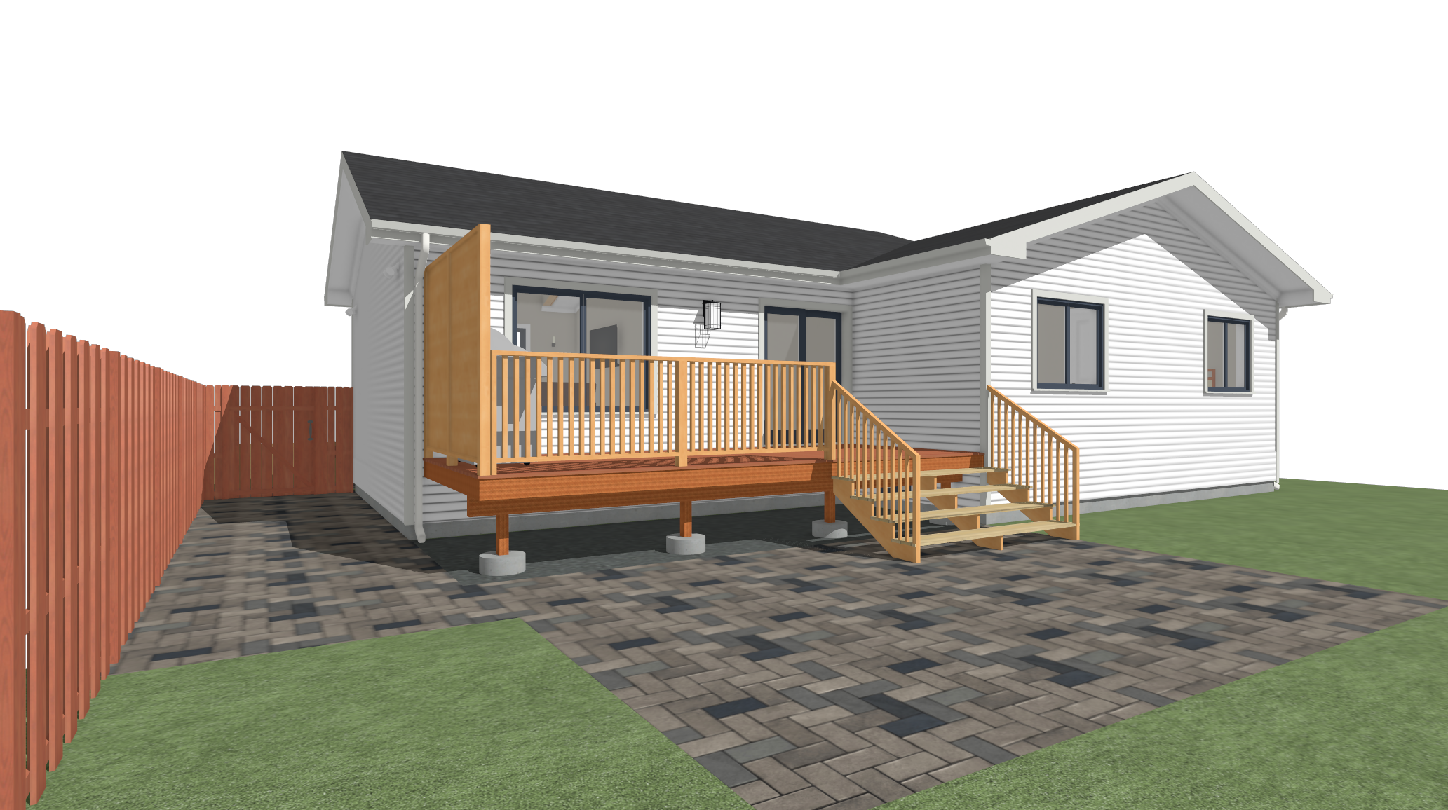 do not change the structure door or window locations siding should be a dark green color windows are white background is a light forest walkway is innerlock pavers add chairs and firepit to the patio