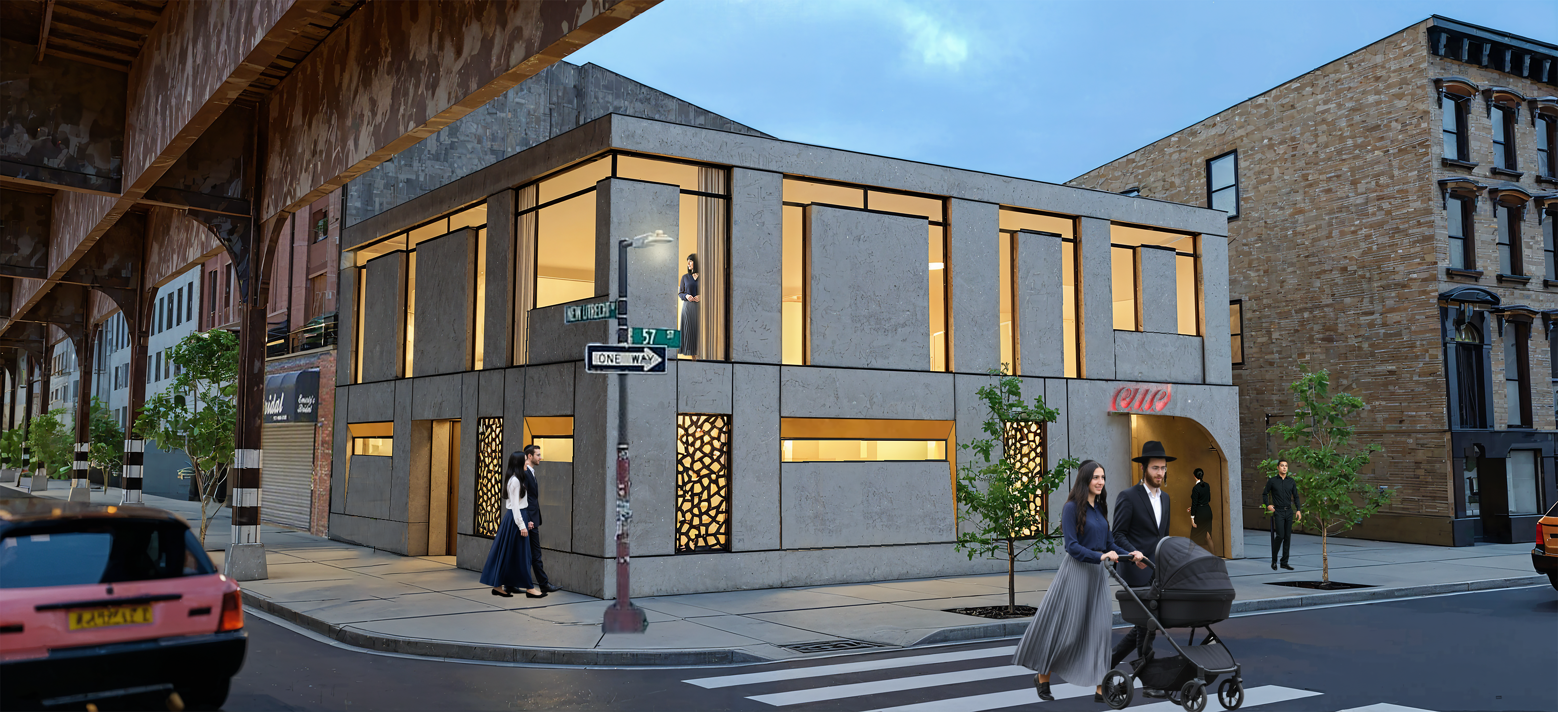 contemporary two story fa ade with smooth concrete panels in a pronounced grain texture bronze metal accents and elegant bronze lattice details large glass windows reveal a warm well lit interior urban brooklyn street under an elevated train line cinematic dusk atmosphere around 5 pm ultra photorealistic architectural render