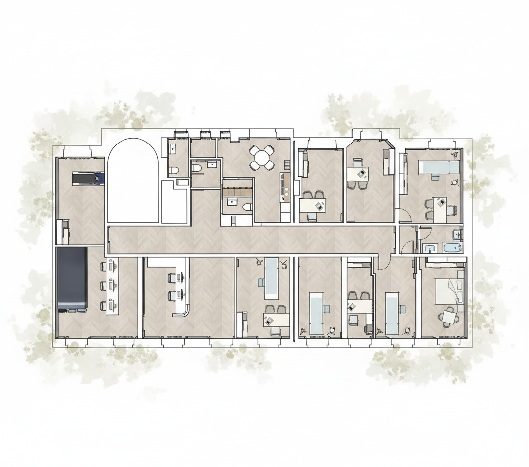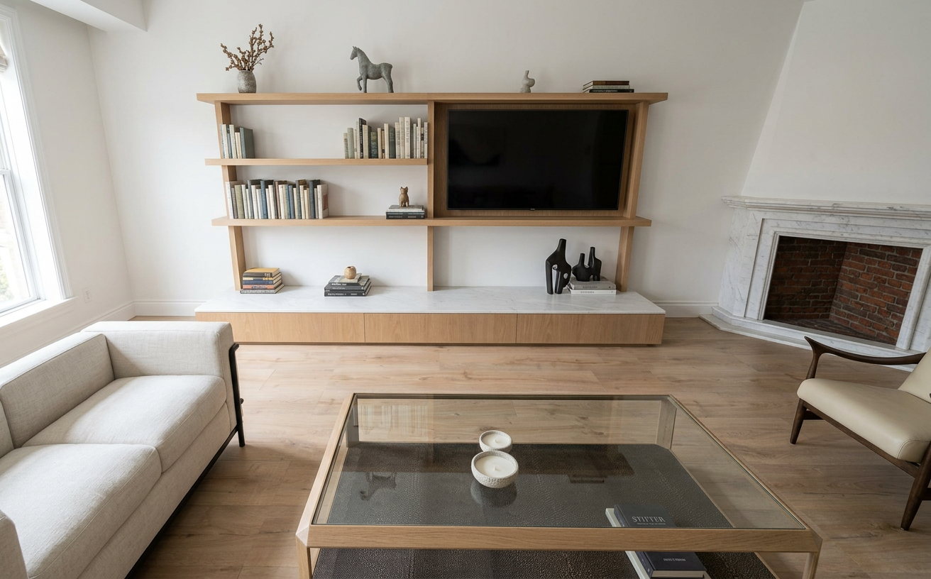 convert this architectural rendering into a highly realistic editorial style photograph while maintaining the exact architecture layout materials cabinetry design and proportions shown in the rendering do not redesign restyle or modify anything no creative interpretation only enhance realism all materials colors finishes and design selections must remain exactly as they appear in the rendering the flooring and cabinetry should match the same material and tone as the kitchen images msi mccarran herringbone in ladson color maintain the exact color already shown while enhancing realism through natural wood grain subtle tonal variation and a soft matte finish the herringbone pattern should appear crisp properly scaled and accurately aligned countertops are honed taj mahal quartzite maintain the exact slab color and veining pattern while enhancing natural stone realism with subtle depth soft honed surface reflection and realistic edge thickness avoid glossy or exaggerated stone movement the backsplash is tilebar montauk gin white 4x4 mixed finish ceramic tile the tile should appear handcrafted with subtle variation in surface texture and finish maintain the exact tile layout while adding realistic grout lines slight tonal variation and soft light reflection consistent with mixed ceramic finishes lighting should match luxury editorial real estate photography soft natural daylight balanced exposure gentle shadows for depth accurate reflections on stone and tile natural interior brightness without blown highlights camera style should resemble professional architectural photography full frame camera 35mm lens perspective straight vertical lines natural depth of field crisp material clarity do not add or remove furniture decor appliances fixtures or architectural elements do not alter proportions or materials the goal is strictly to enhance realism and photographic quality while preserving the original design exactly overall mood refined natural luxury real estate listing photography