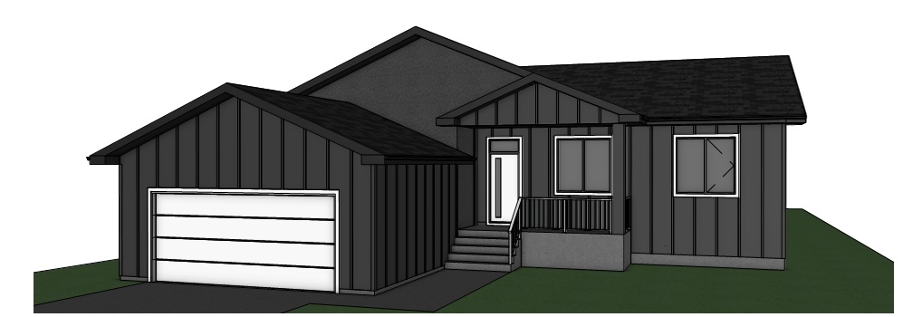 house is in a development on a lake on a treed lot in winter with a purple car in front on the driveway