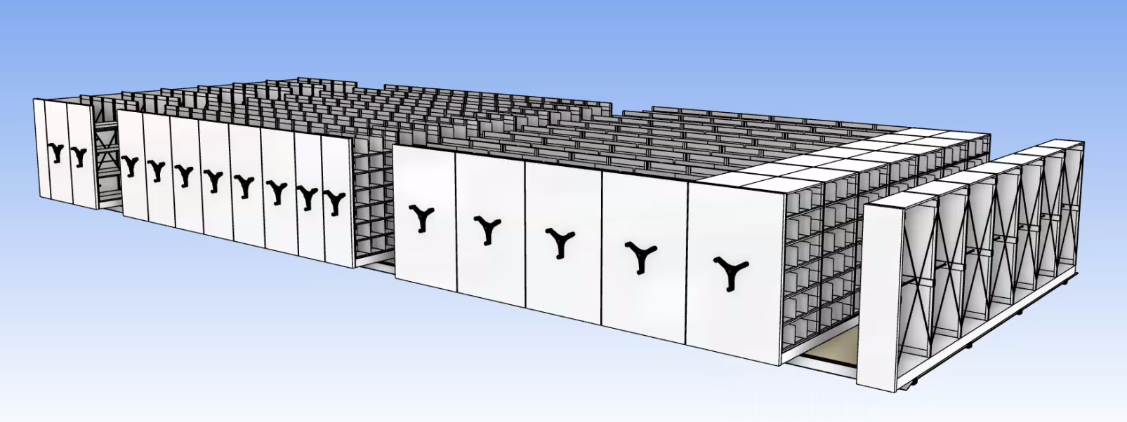 please show this storage system in a warehouse that is only a few feet taller with ceiling mounted led lighting and concrete floors