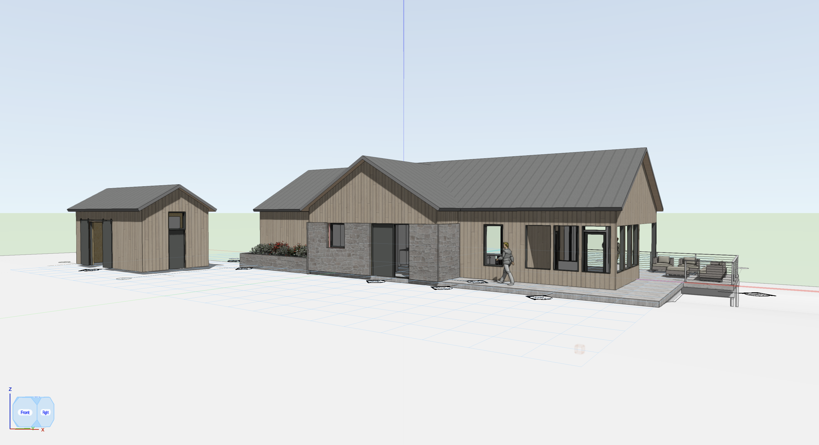 modern cabin in the boreal forest create a gravel parking lot in front of the house