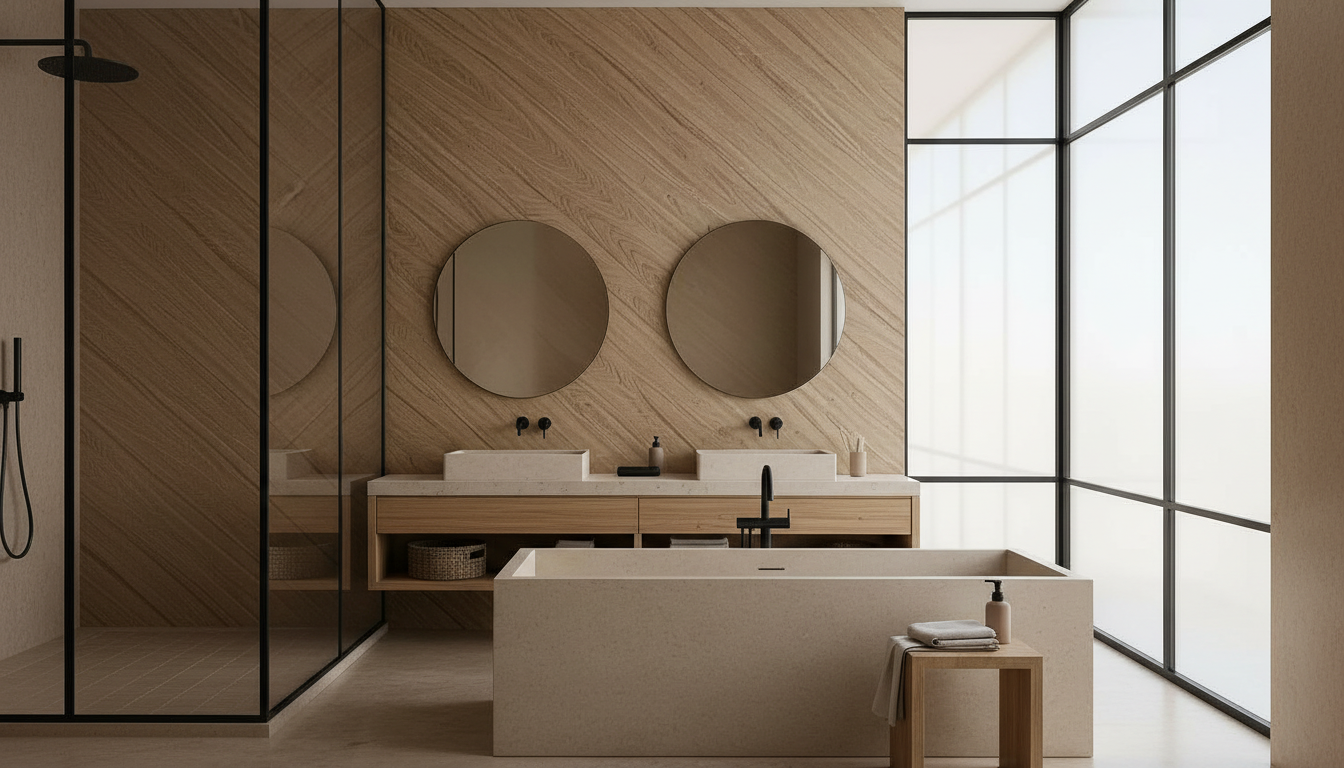 casual party at sunset table set for dinner and appetizers on the kitchen island me women with wine glasses with snowy pine forest out the windows