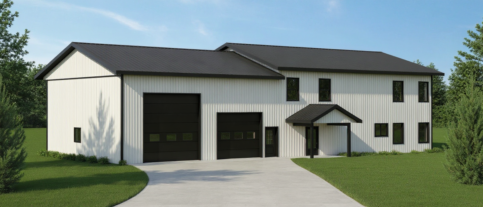 modernist exterior shot a modern farmhouse scene featuring a sleek white exterior with vertical steel siding complemented by a dark charcoal gray metal roof the atmosphere is serene and tranquil surrounded by a lush vibrant green lawn wooden beams with a natural finish support the spacious porch casting soft shadows in the background a line of tall whispering pine trees creates a natural border their deep green needles contrasting against the soft blue sky dotted with fluffy white clouds the overall ambiance is peaceful and inviting bathed in the gentle glow of natural daylight architecture